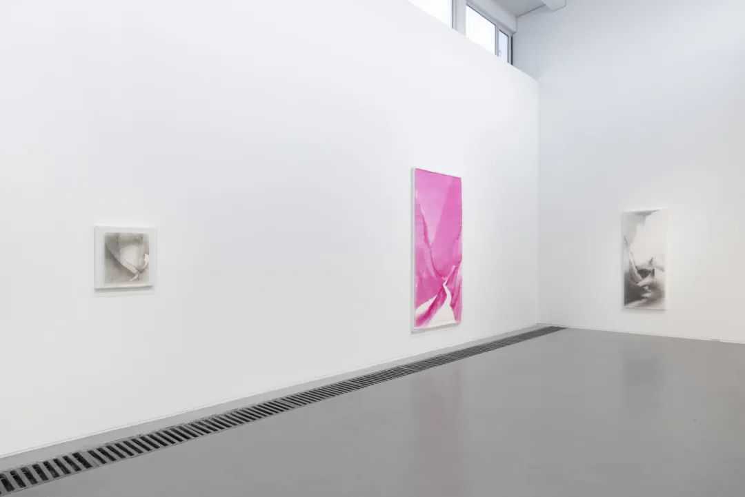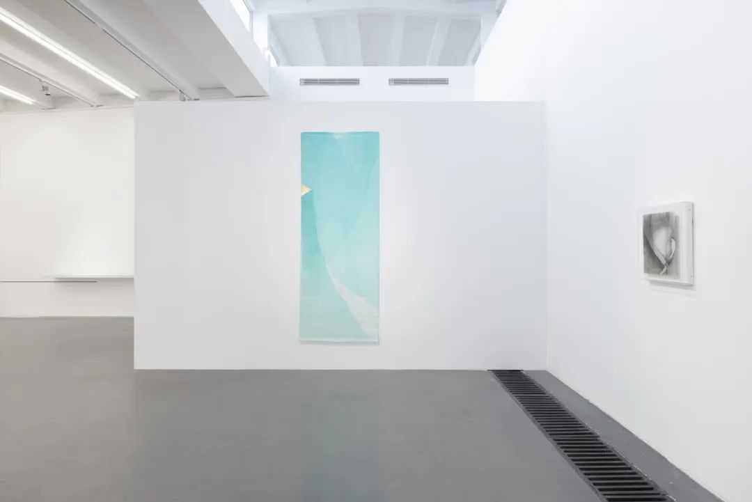 追求极致的成果,最终让沈勤大胆地将这张石绿为主旋律的山水作品,从亚洲艺术中心的展墙边自然垂挂而下。人走过带起风,引画作自然晃动,边缘微卷,将自然的通透质感推到了某种极限。