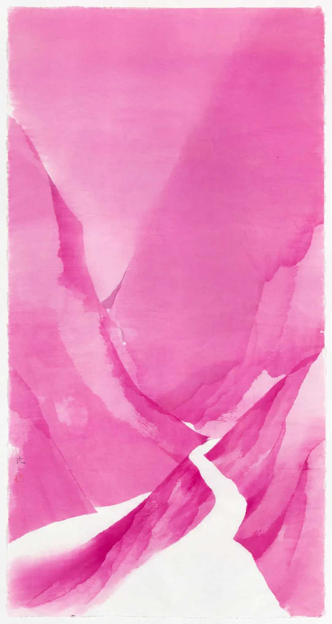 所有“减法”考虑之外,也有值得注意的“加法”——反复出现在园林系列里的“招牌”勾线,以更加超现实主义的面貌回归了。这些线段被他灵光一现地,引入到浅淡的山水间,在他所创造的山水图式中,留下沈勤独有的印迹。