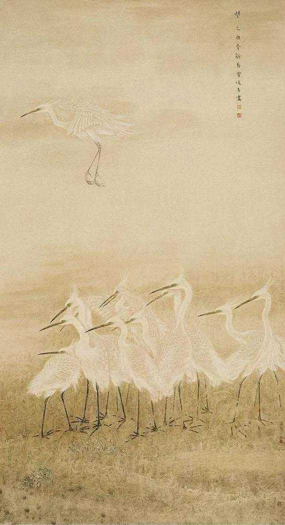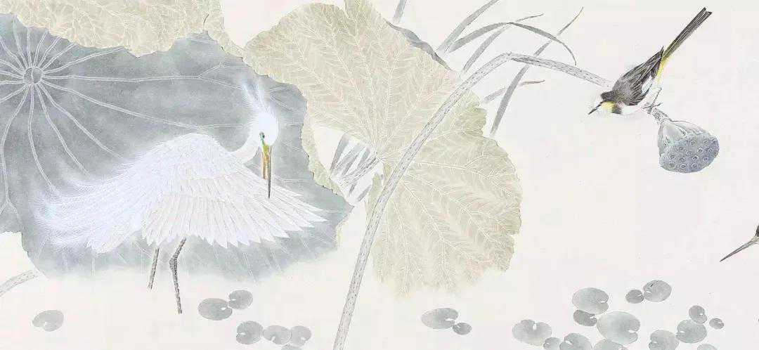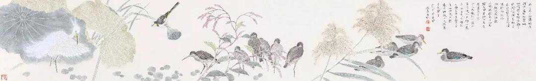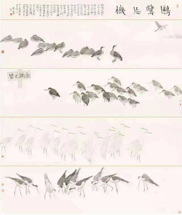 《鸥鹭忘机》,以一幅长卷分成的四段分别描写了鹬、鹭、鸥、雁四种以水生物为生的候鸟,这四种候鸟栖居于湖泊、浅滩、湿地,它们的生存状态对自然生态资源有着极为严格的要求,因而,“鸥鹭忘机”所表达的“忘机”,既是四种不同水鸟之间和谐相处、各得其所的“忘机”,也是它们物我为一、相忘于自然的生态景观。画作于此表达的并不仅限于一种诗意的抒发,而是现代化社会如何保护生态、共筑人类生存家园的主题。