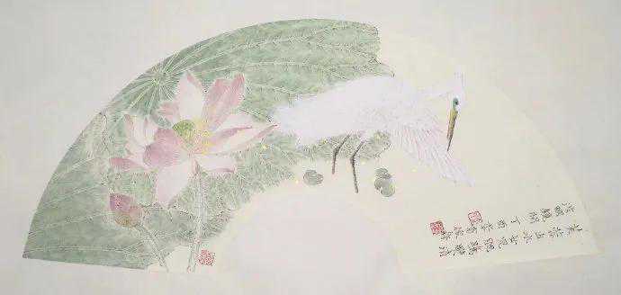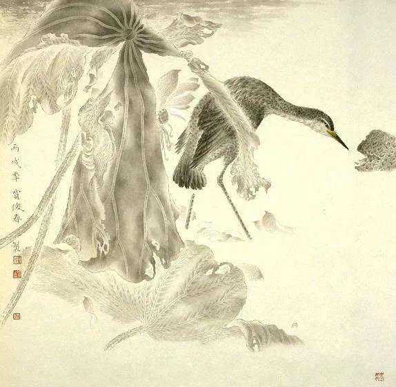 贾俊春《野塘逸趣》作品采用场景化构图,表达出少见的视野和空间深度,以至跨越了花鸟画与山水画的边界,这会让以往看惯了折枝花鸟画的观众感到很新鲜。