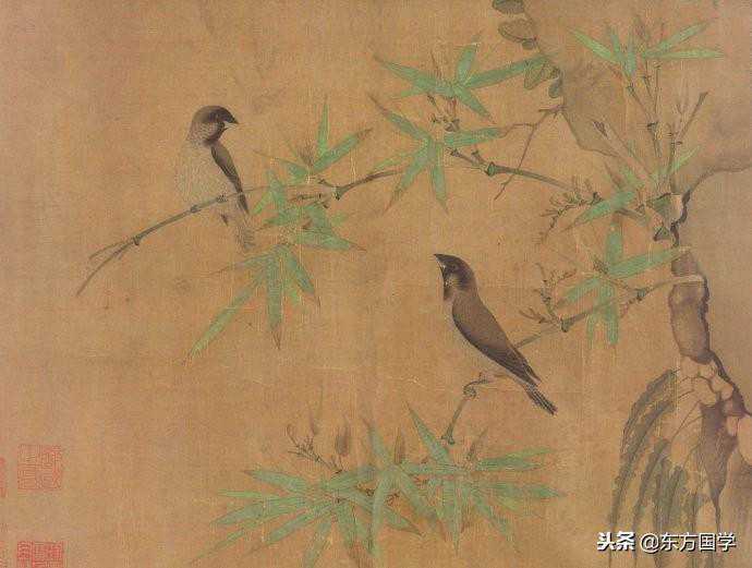 宋人花鸟画都以小品画见长,又以精细写实见功,这幅画也不列外,此幅《竹禽图》横55.4厘米,纵33.8厘米,现藏于美国大都会博物馆。图中意笔崖石间伸出两枝翠竹,竹枝一上一下各栖一只小鸟,两只小鸟四目相对、相互顾盼,仿佛合鸣。据传宋徽宗画小鸟,常用生漆点睛,落笔于画上如小豆一般,生动传神。