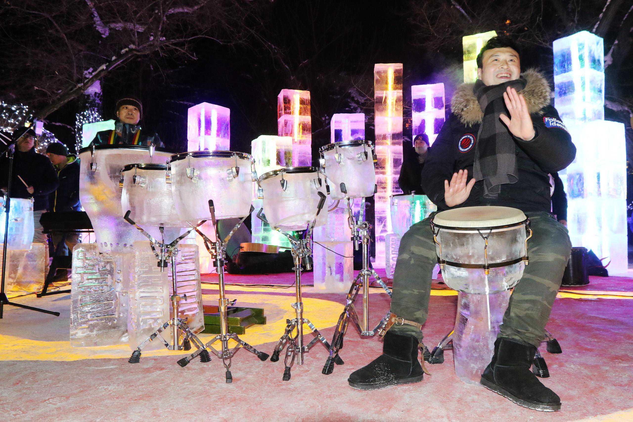 我觉得挺有意思的,2016年就做了一套非洲鼓。第二年又做了一套架子鼓,这就更费事了,要把鼓架安装到冰上,再蒙上鼓皮,还要调节鼓皮的松紧度,特别考验制作者的功夫。
