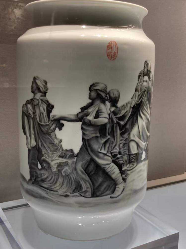 红色经典代代相传,活力永续,当代中国的陶瓷艺术家们更是矢志努力,站在新时代的高度,用当代语汇为红色文化添彩增色。展览中,景德镇著名艺术家解强创作的石库门大型方瓶,用景德镇瓷土为海派文化代言,向红色文化致敬;学院派艺术家张国君历时两年多反复实验、烧造出大型瓷板画《井冈山》,将个人风格与时代精神相结合,将红色文化融入艺术创新中,体现出中国陶瓷文化百年进程的无穷动力和精神源泉。
