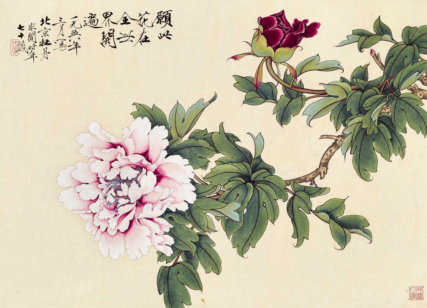 张大千1971年的《揽秀楼图》,画赠新闻界老友张稚琴,笔触老辣,构图雄奇,云雾浩渺,气势非凡。于非闇《双艳》画于1958年,属画家晚年精品,画面绘赵粉、魏紫二朵牡丹,设色明艳厚重,刻绘精工已极,牡丹娇艳欲滴之态跃然纸上。