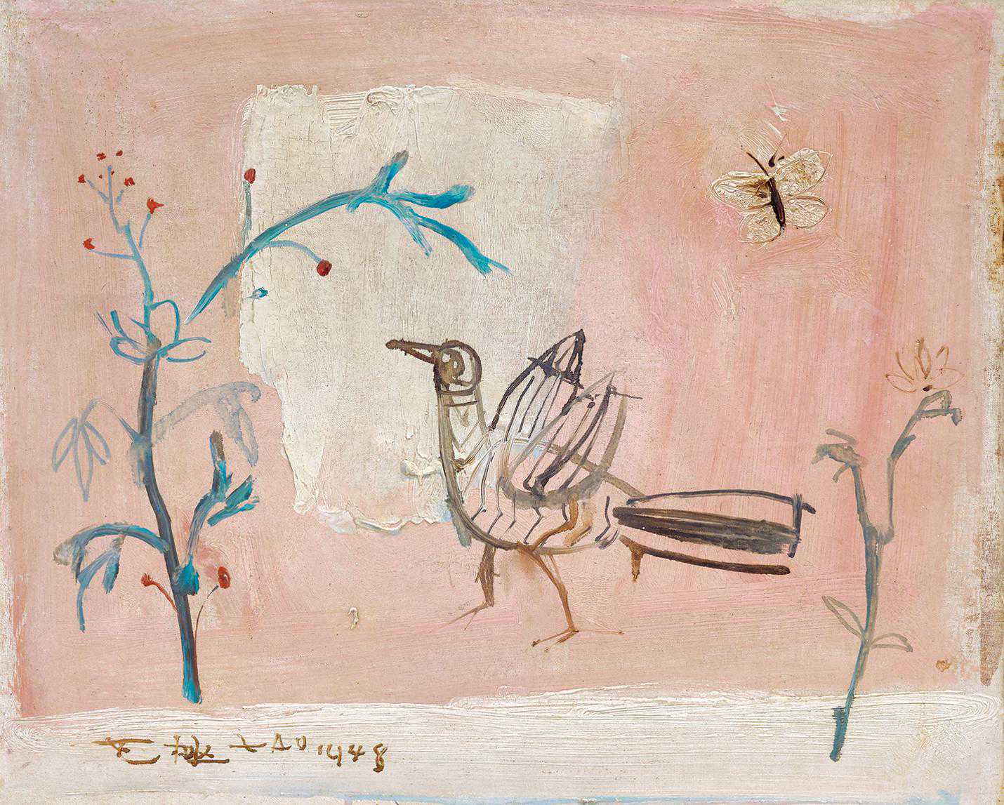 现当代艺术专场甄选百余件拍品,汇聚多位名家杰作。赵无极的《无题(鸟)》创作于1948年,画中以线条勾勒鸟、树、蝴蝶,属其具象时期的典型风格,画面的粉、蓝色调清新、甜美;其后赵氏曾以此件作品为母本之一制作版画,法国诗人亨利·米修赋诗八首,成册刊印,对赵无极早期在欧洲的宣传起到重要作用。