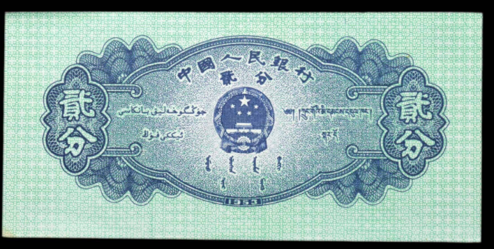 反面背面图案印有国徽和汉、蒙、藏、维4种文字的“中国人民银行”及“贰分”字样。五分分也是竖着的样子。看上去也是十分漂亮。