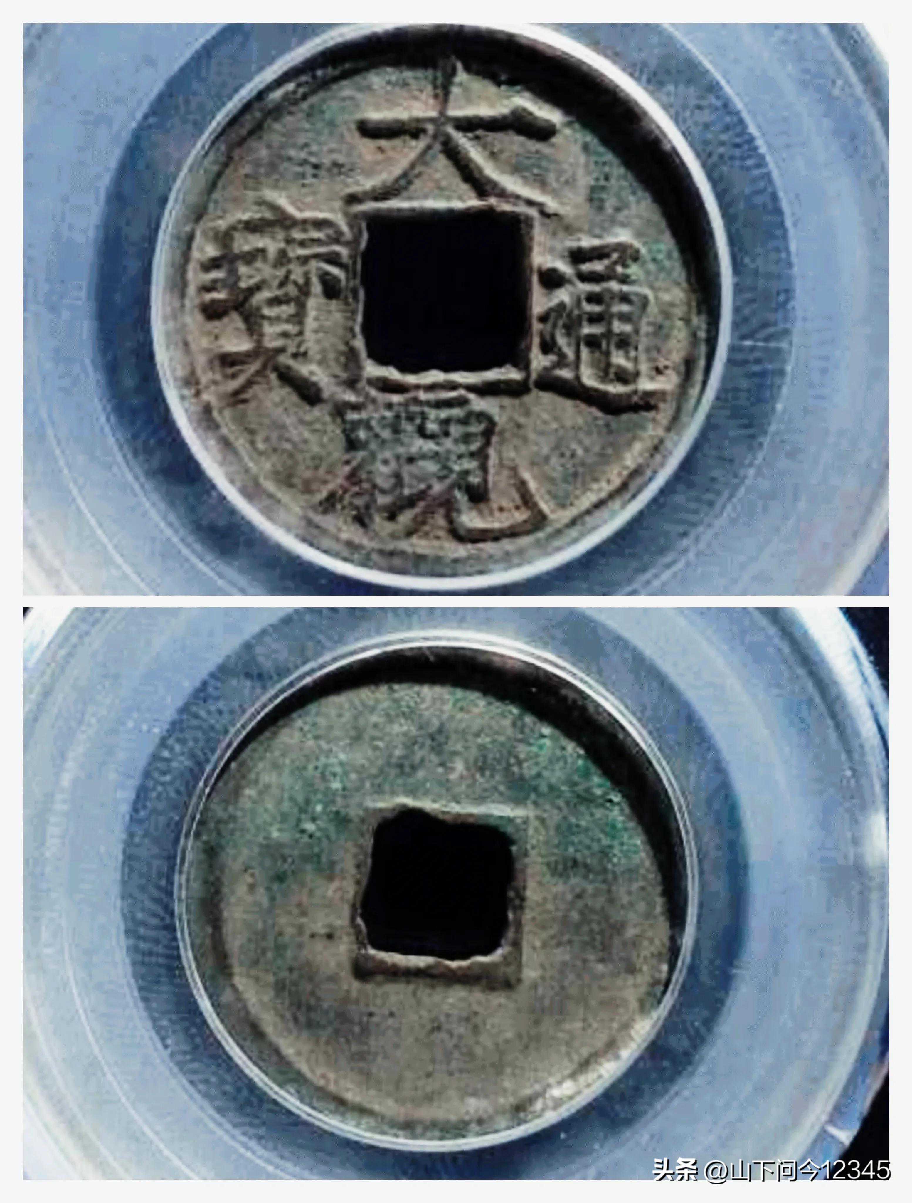 俯大六级币,实际上好看不好找啊,这一版和小字版比较像,但是最主要特征看来,俯大的字体明显要大很多,尤其观字大很多,宝字也是昂起的,“通”字的走之底的转折点高于内郭下沿,大字微俯,大字捺笔平直纤细,宝字的左足不寄郭。学完此版,十级币“小字”就不用学啦,多对几次就会了。