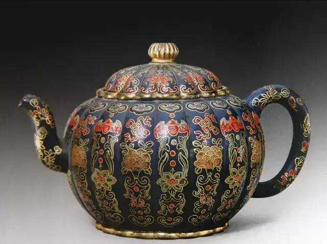 6.紫砂壶包金漆的货色,是在乾隆以后涌现的。加彩凸雕瓜果紫砂壶为乾隆时期的风格。