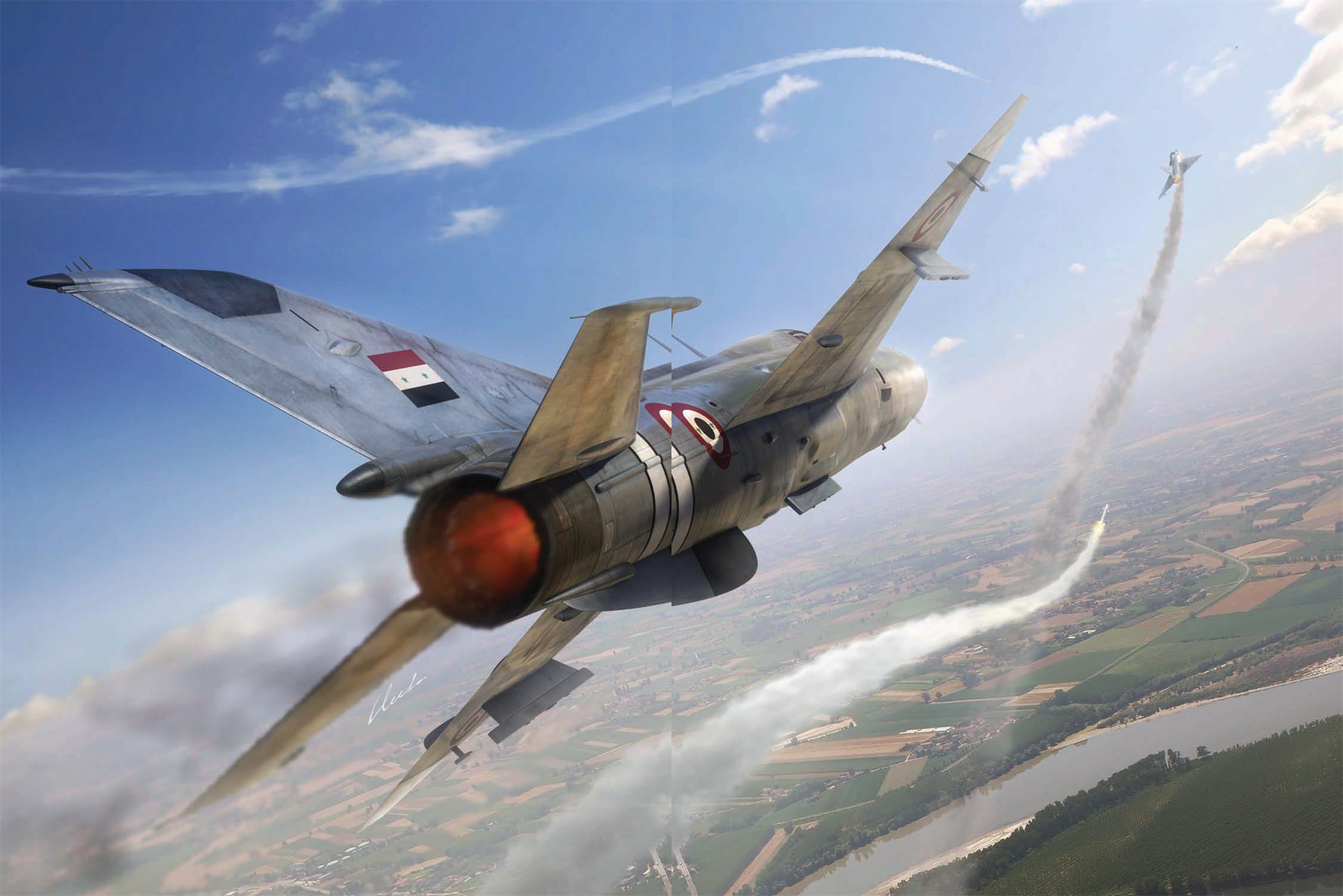从40年代后期开始,战斗机设计人员对简单的无尾三角翼结构非常的感兴趣,尽管无尾三角翼飞机的升阻比更高,但由于机翼后缘非常靠后,在放下襟翼时将会产生较大的低头力矩,飞机着陆时难以取得平衡,故无法采用襟翼这种增升力装置,因此着陆滑跑距离变得较长,这对前线歼击机来说自然是相当不利的。另外无尾三角翼飞机着陆时必须保持比有尾飞机大得多的迎角,而大的迎角也使飞行员难以看到跑道,使着陆更为困难,很多国家放弃了这种结构,只有法国的达索公司和苏联的米高杨设计局坚持使用无尾三角翼,他们的幻影IIIC和米格-21都是三角翼设计,这两款战斗机在出口市场都取得了相当大的成功,70%的幻影IIIs都是卖给外国客户的,米格-21可能接近30%是卖给外国客户的,总岀口量大约是1000架幻影IIIs和大约4000架米格-21,其中很多在在中东上空同台竞技,两者相遇,谁更出色呢?