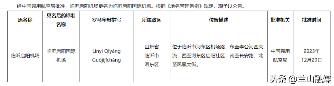 其中,经中国民用航空局批准,临沂启阳机场更名为临沂启阳国际机场;大同云冈机场更名为大同云冈国际机场;湛江吴川机场更名为湛江吴川国际机场。