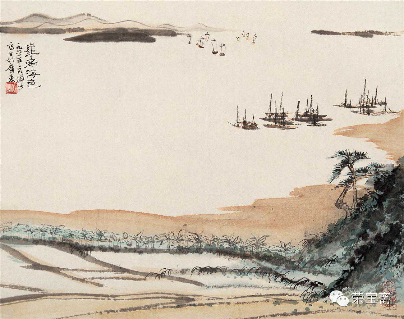 题识:沙水弄夕晖,树树笼烟翠。每于江渚行,悟得米三昧。一九七九年