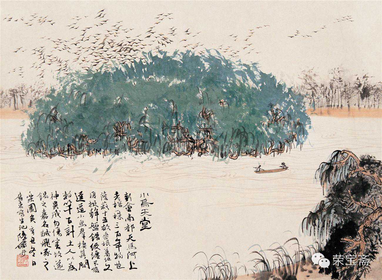 题识:小鸟天堂。新会南郊天马河上老榕一株,三百年物也。荫蔽十五亩,垂根着地,又复挺干,盘错绞缠,不容径道。小鸟群栖其间,数以千百计。土人以为神异,戒勿伤害。故遂锡之嘉名,诚飞啄之乐园矣。辛丑冬日广东写生记,陆俨少。