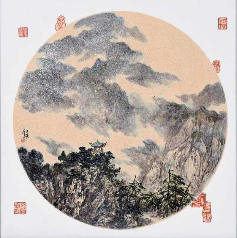 楫、草庐、亭榭、飞鸟,这静寂的山便神奇地有了生气。江葆华画中的山峦连绵,云雾暗晦,显得平淡而幽深,苍茫而深厚。他用笔清雅,设色平稳秀丽,布局严谨,构图丰满,意境深远。