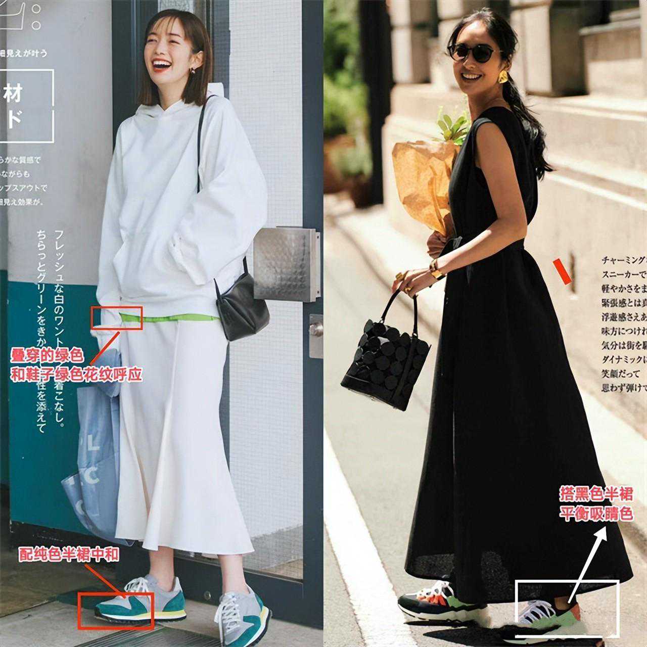 倘若追求成熟稳重的风格,黑色连衣裙搭配黑色运动鞋也是极佳的选择,此时,彩色鞋款同样能起到画龙点睛的作用,使原本可能稍显沉闷的造型瞬间生动起来。