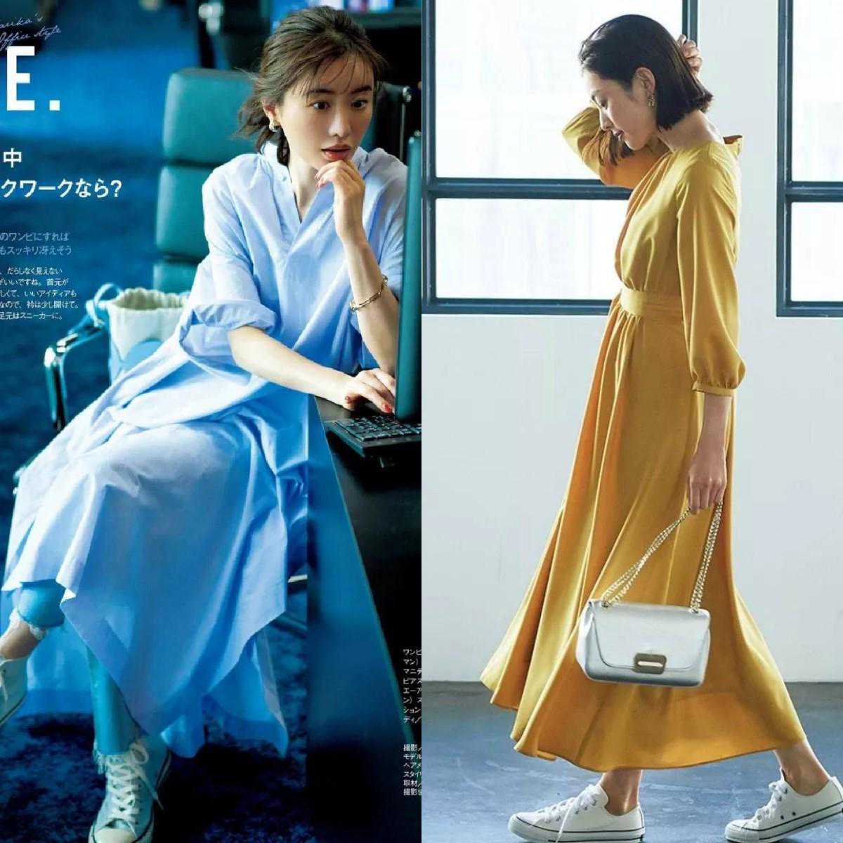 腿部曲线的轻微外露不仅可以拉长身姿比例,还可以让运动鞋的设计细节和色彩表现得更加充分,从而使整体形象更加精神、明快。因此,正确的穿搭方法是寻找平衡点,让长裙与运动鞋相辅相成,共同演绎出既舒适又具时尚感的穿搭艺术。