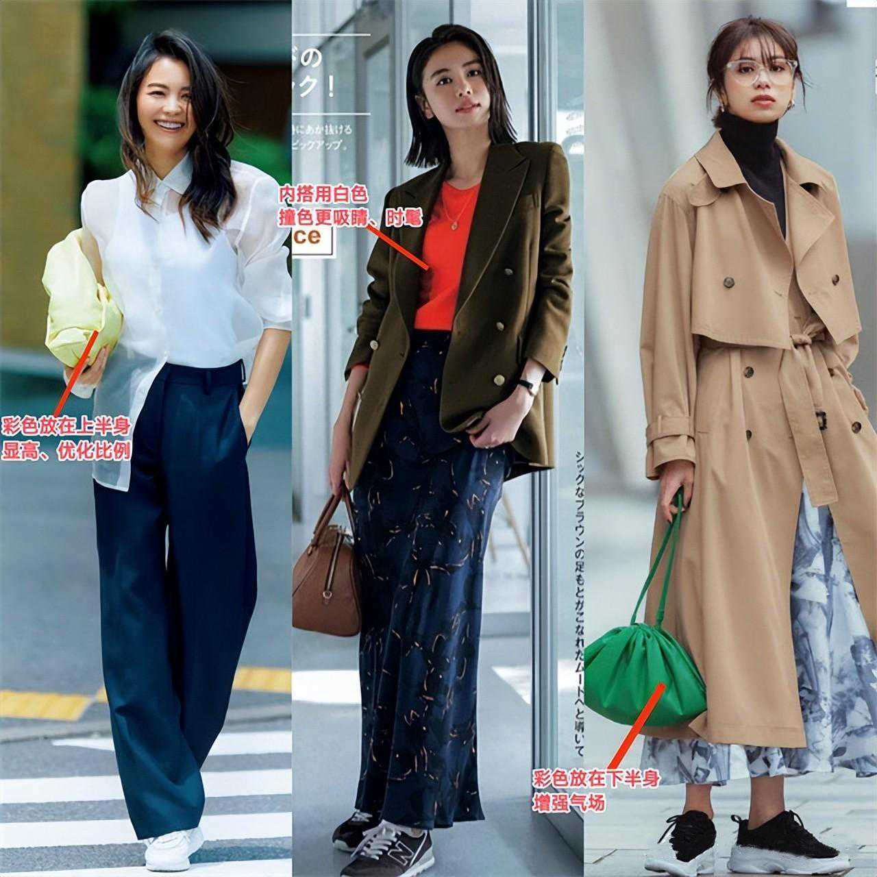 在基础色的背景下,利用小物件来注入颜色元素是一个安全而又有效的策略。例如,在一身黑白灰的穿搭中,搭载一款糖果色的包包或者是内搭一件亮色上衣,都能为造型带来意想不到的惊喜效果。