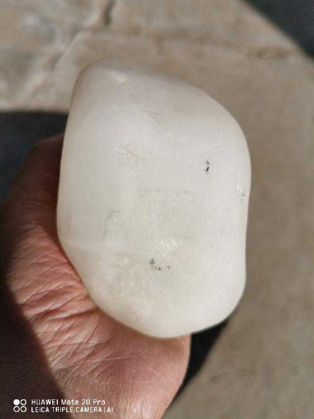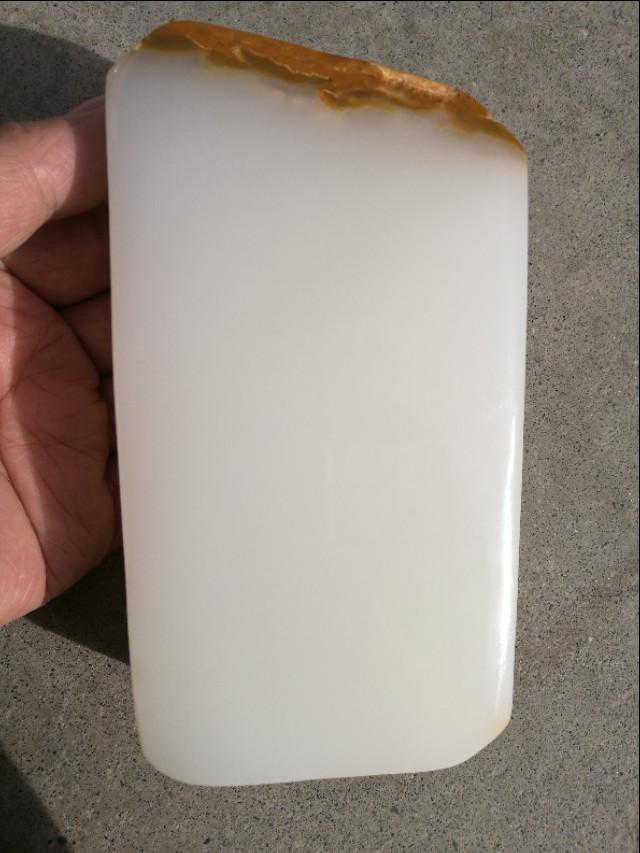 石英岩玉是指石英含量在百分之九十以上,其主要成分除石英外,还含有铬云母、绢云母、锂云母、赤铁矿、蓝闪石等矿物。石英岩玉的结构呈现出的是均匀的细小颗粒状,非常的均匀且没有纤维交织状的排列结构。大多数石英岩玉的细度都非常好,甚至过灯无结构。而大部分和田白玉的细度都达不到这一标准,因为和田白玉大多十白九松,越白的料子大多结构越明显。判断这两者,除了观察它们的内部结构,还要从价格上作一个参考。细度好到能和好一点的石英岩玉一较高下和田白玉,价格一定不便宜。如果遇到一块又白又细的成品挂件或原石,而且价格又便宜,一定得小心了。石英岩玉虽然细度好,但水头略大,脆性大,缺乏韧性,沙性大,油性差,而且储量巨大,没有文化内涵,收藏价值不高。与石英岩玉相比,和田玉的内部结构则能够看出细小的纤维状矿物成分交织在一起,而且不同的地方可能结构也会不一样。两种原石未抛光之前很好区分,但是如果一块好点的石英岩玉做出成品,再抛成高光,与和田白玉青海料或新疆部分矿点开采的白玉山料加工出来的成品极为相似。下面我们一起欣赏几块与石英岩玉比较接近的新疆和田白玉。