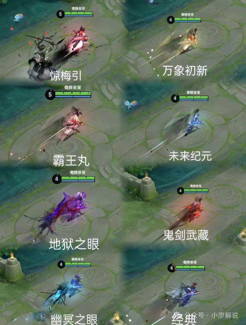 二技能来讲几款前面几款其实还没有原皮有特色,原皮还会出现宫本的虚影,这样才有瞬移的感觉,其实就是感觉每一款的帧数都不一样,有些更加模糊,有些就清晰一些,接着就是幽冥和地狱这两款,残影的元素是比较突出的地方,点缀元素和配色上都是比较新颖的,很有大佬的风范,出其不意就出现在你身边的感觉,惊梅引则是在虚影的造型上画了更多的心思请设计,因为在其他地方体现不出特效来了,而这款特效变成的更像是一个虚影在那里鼓舞,士气大振的感觉,水墨的配色搭配色彩梅花的颜色,对比很鲜明。