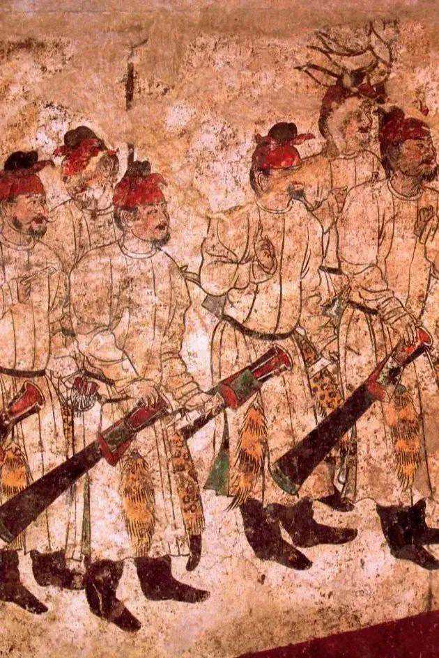 下:唐神龙二年章怀太子墓《仪卫图》(局部),男子身着圆领袍,两肩无开口