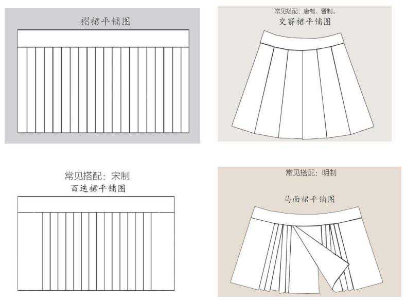单看上身效果,有人可能把日本行灯袴和中国古代服饰中的下裙搞混。中国古代的下裙主要分为褶裙、交窬裙(也叫破裙)、百迭裙、马面裙四种,平铺图如下: