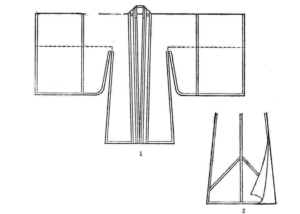 黄昇墓出土广袖袍形制图(1为正视图,2为下摆开岔示意。图自《福州南宋黄昇墓》)