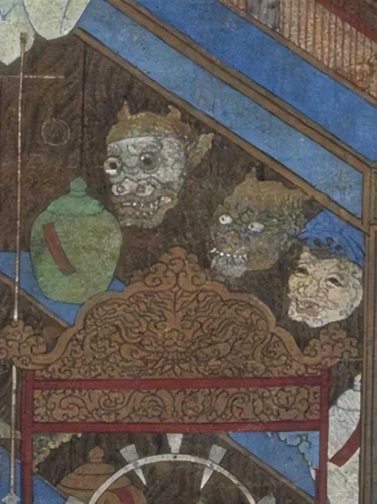 下:明计盛《货郎图轴》局部,故宫博物院藏,货架上有几种面具