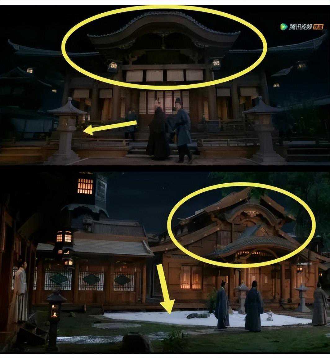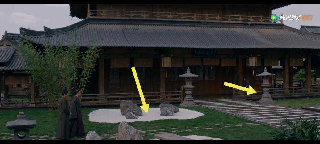 除了日式枯山水之外,这两张剧照中的建筑上,圈出来的部分名叫“唐破风(からはふ)”,在日本传统建筑中,常见于城堡等建筑的正门或者侧窗上方,两侧凹陷,中央凸出成弓形,有些像遮雨棚的形状。