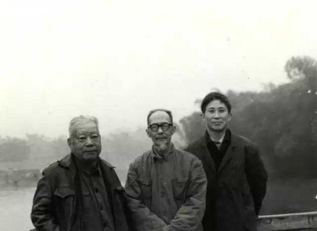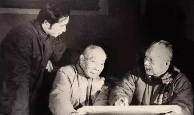 1986年,周碧初与颜文樑(中)一起研究作品