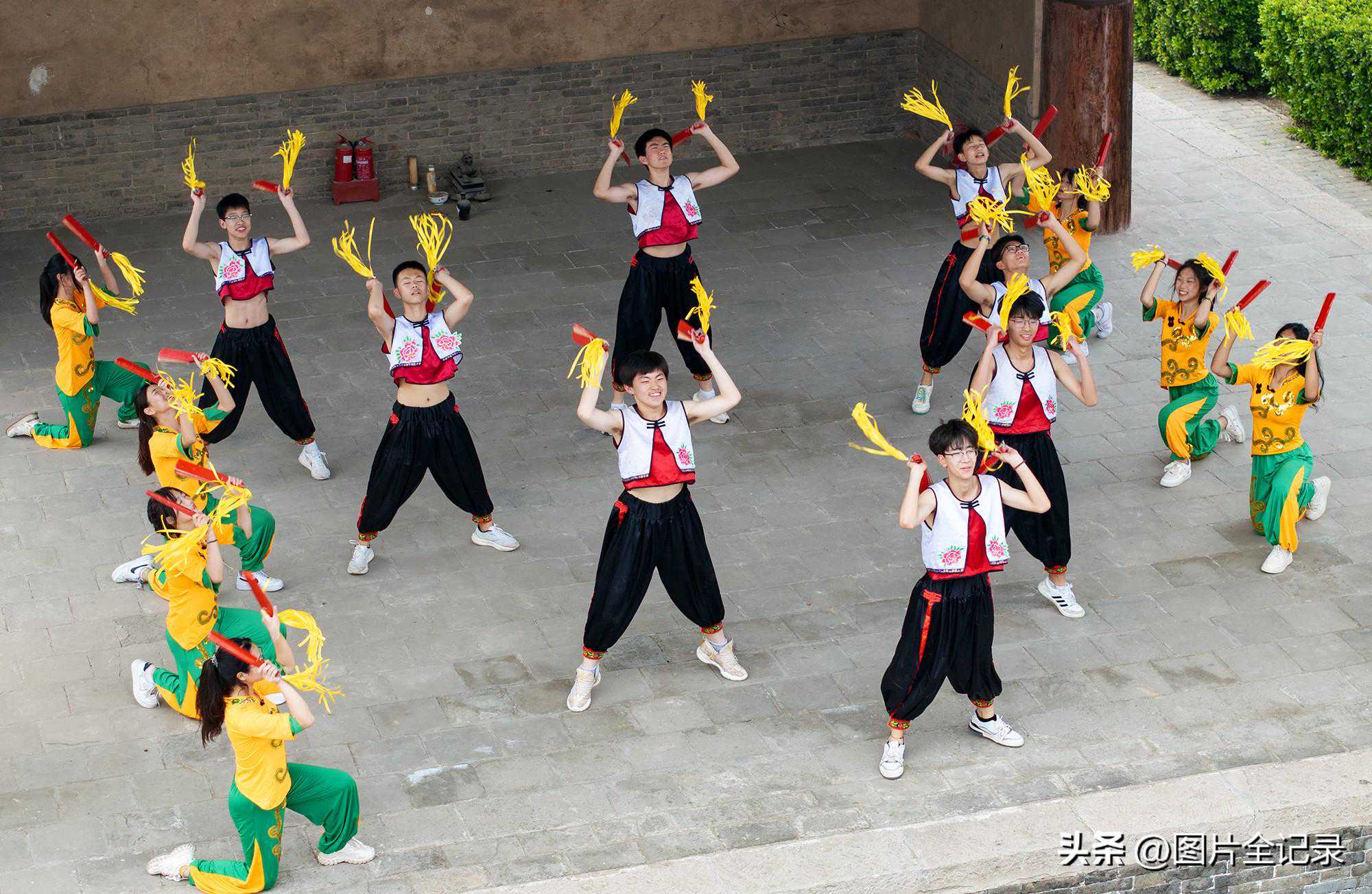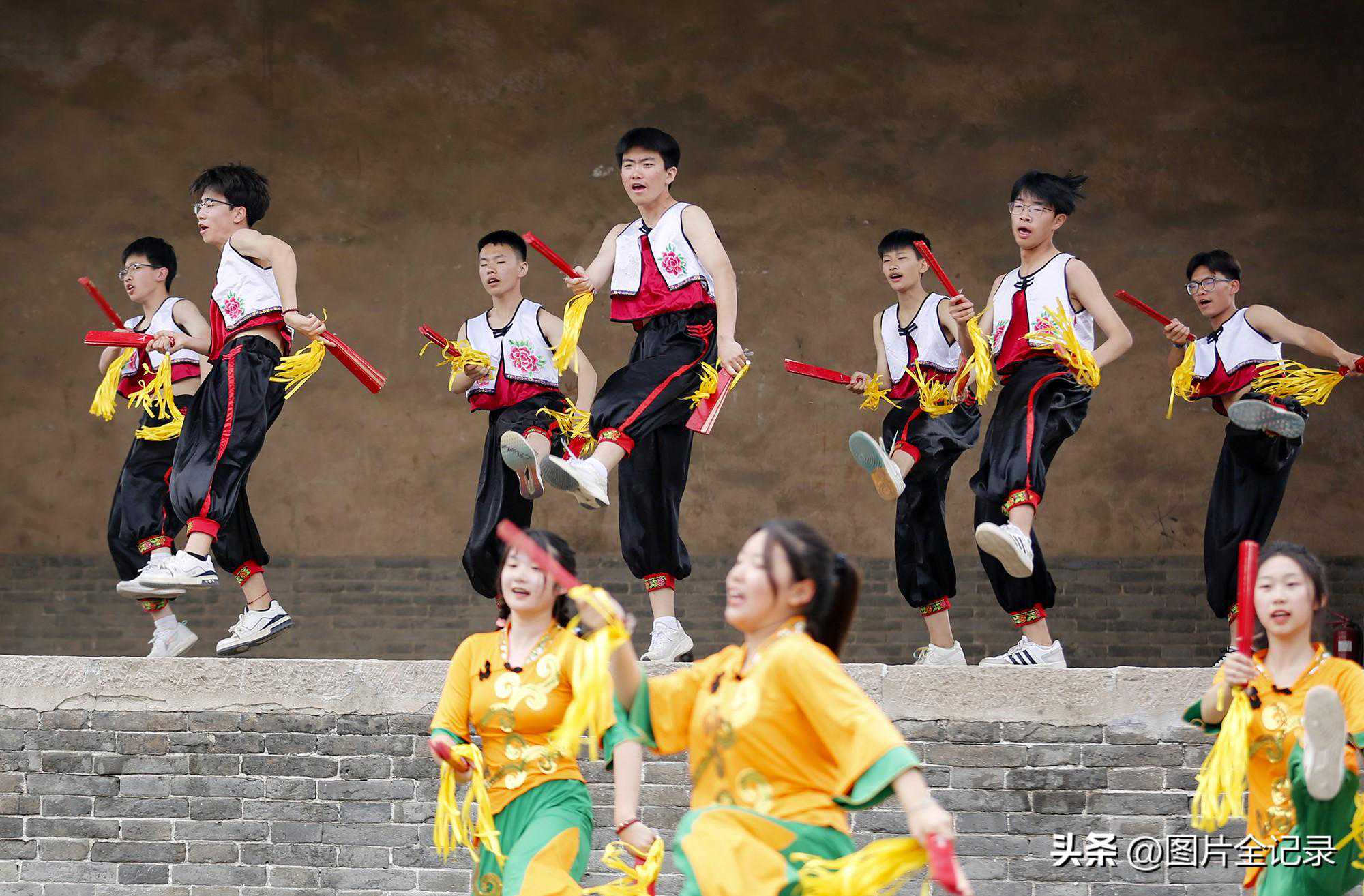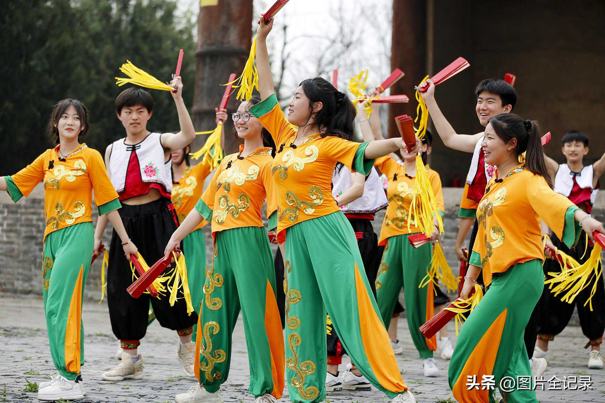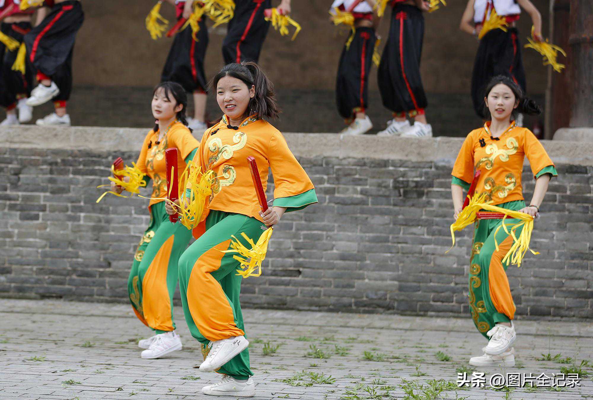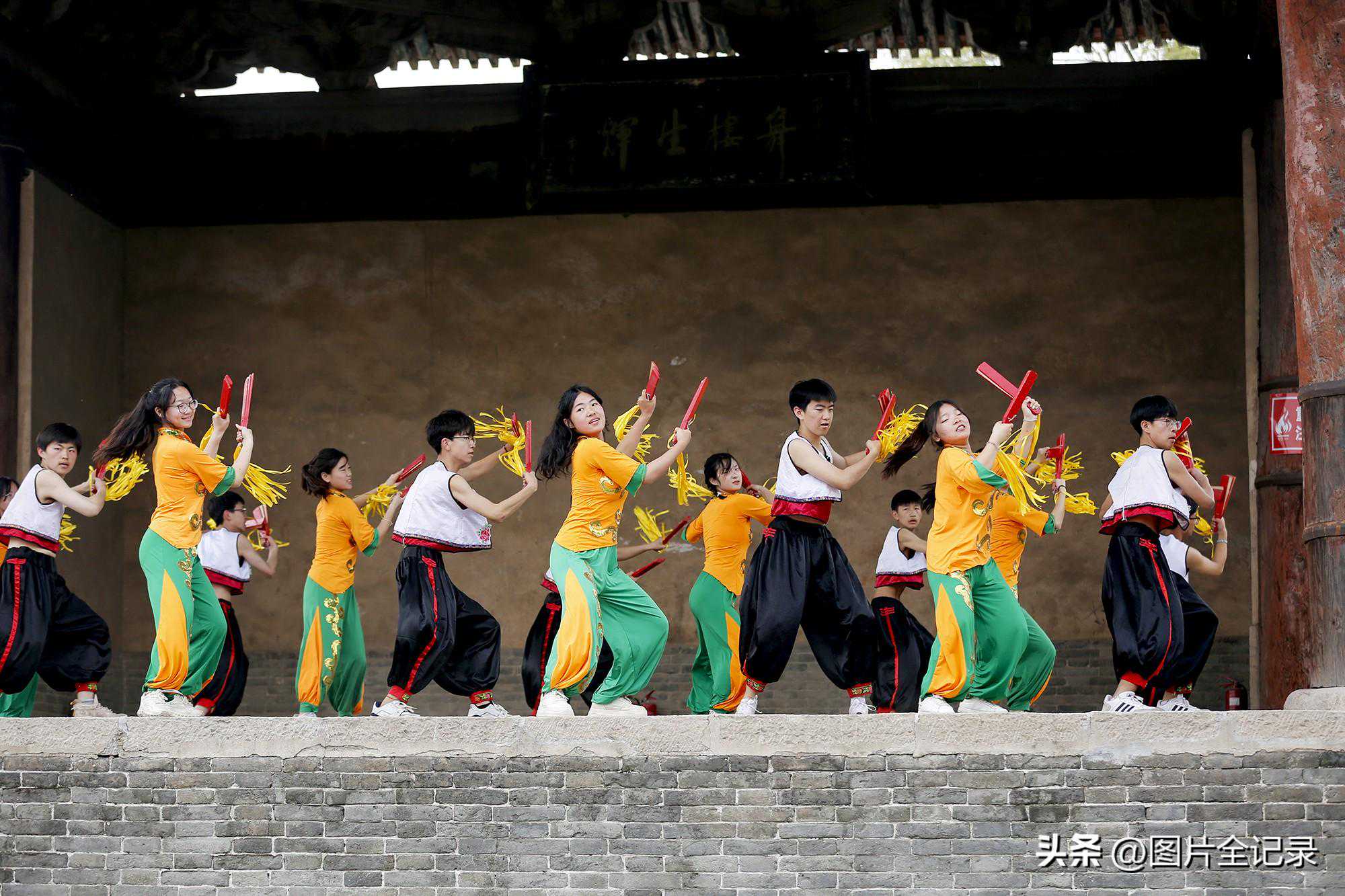 当日,在山西省临汾市翼城县南梁镇武池村乔泽庙元代古戏台前,该县第二中学校的学生们表演国家非遗“浑身板”。只见他们手持浑身板,伴随着轻快的音乐舞动身姿,用木板左拍右擦,上击下打,音效“似掌声悦耳”,舞姿“如飞花着身”,整个表演宛如飞花,动作舒展,优美灵动,气势壮观,吸引众多游人前来观非遗表演,享民俗魅力。