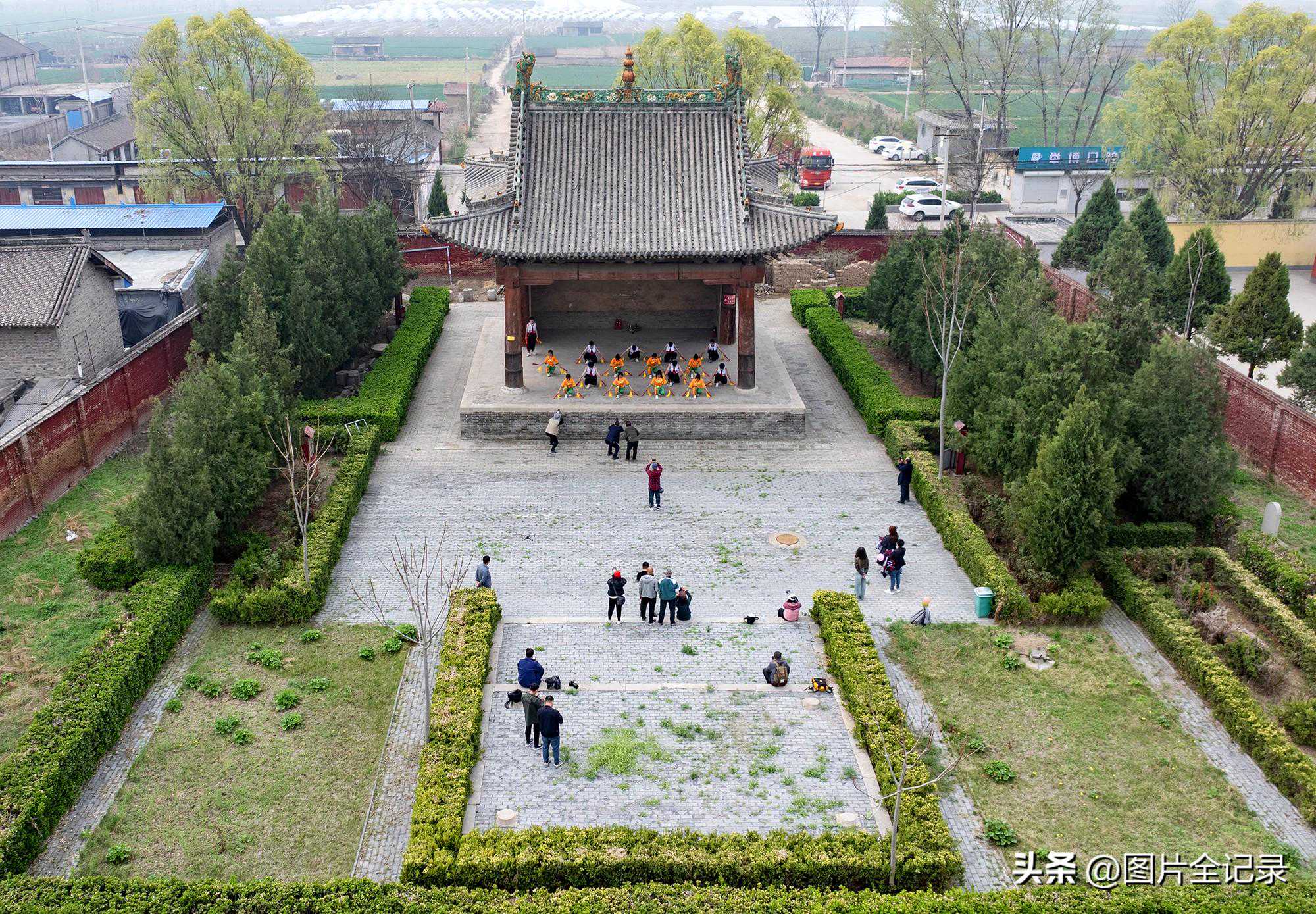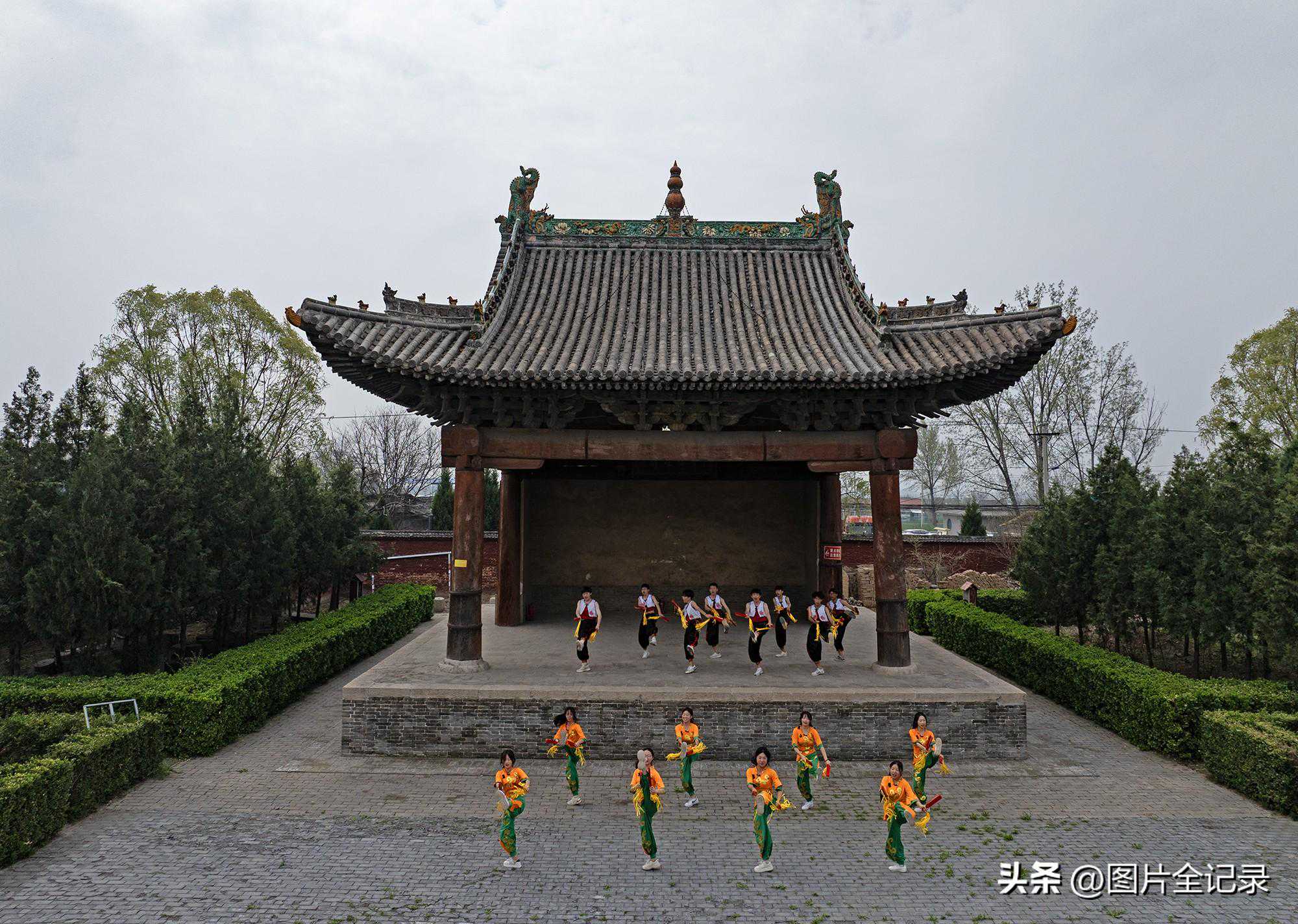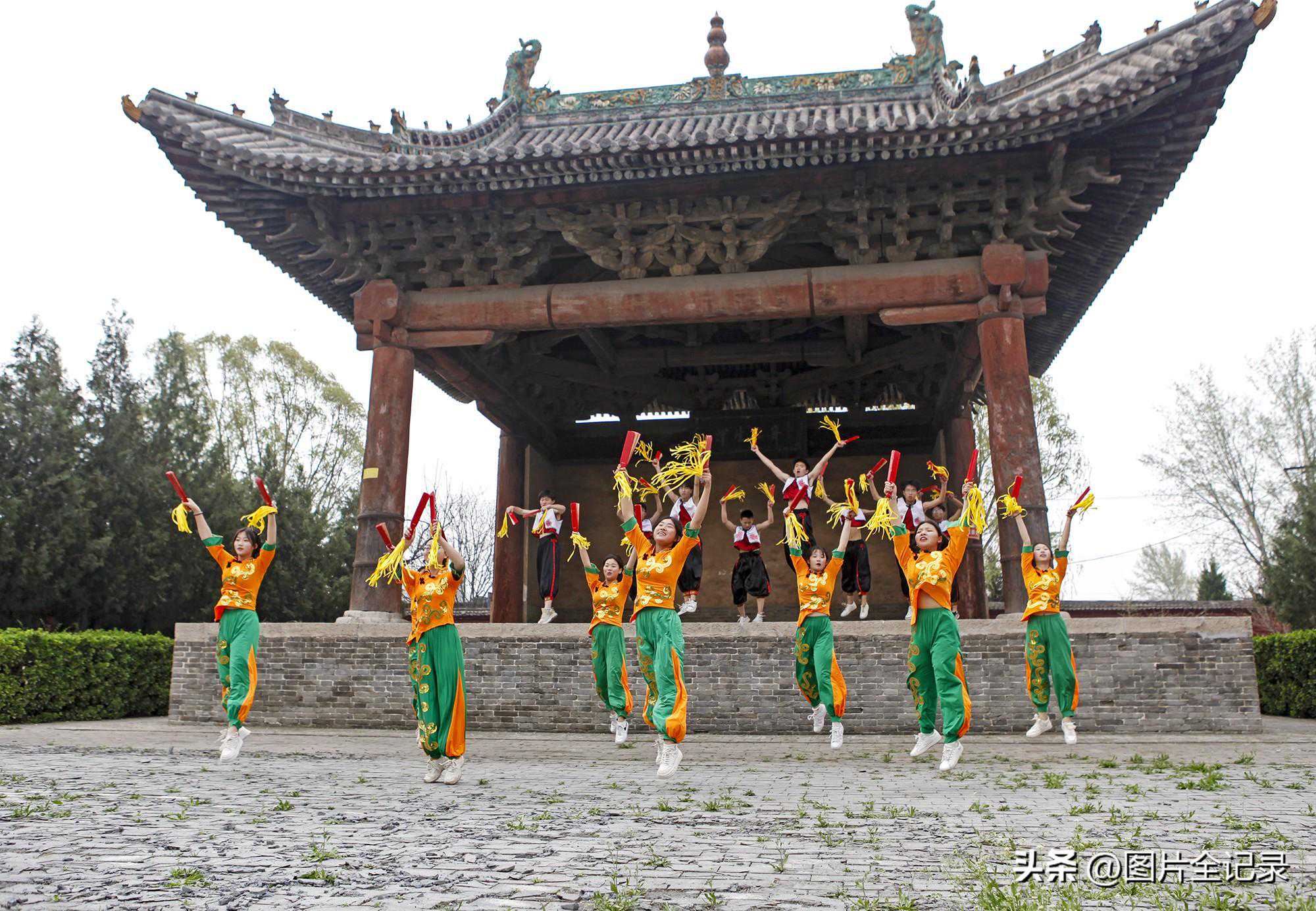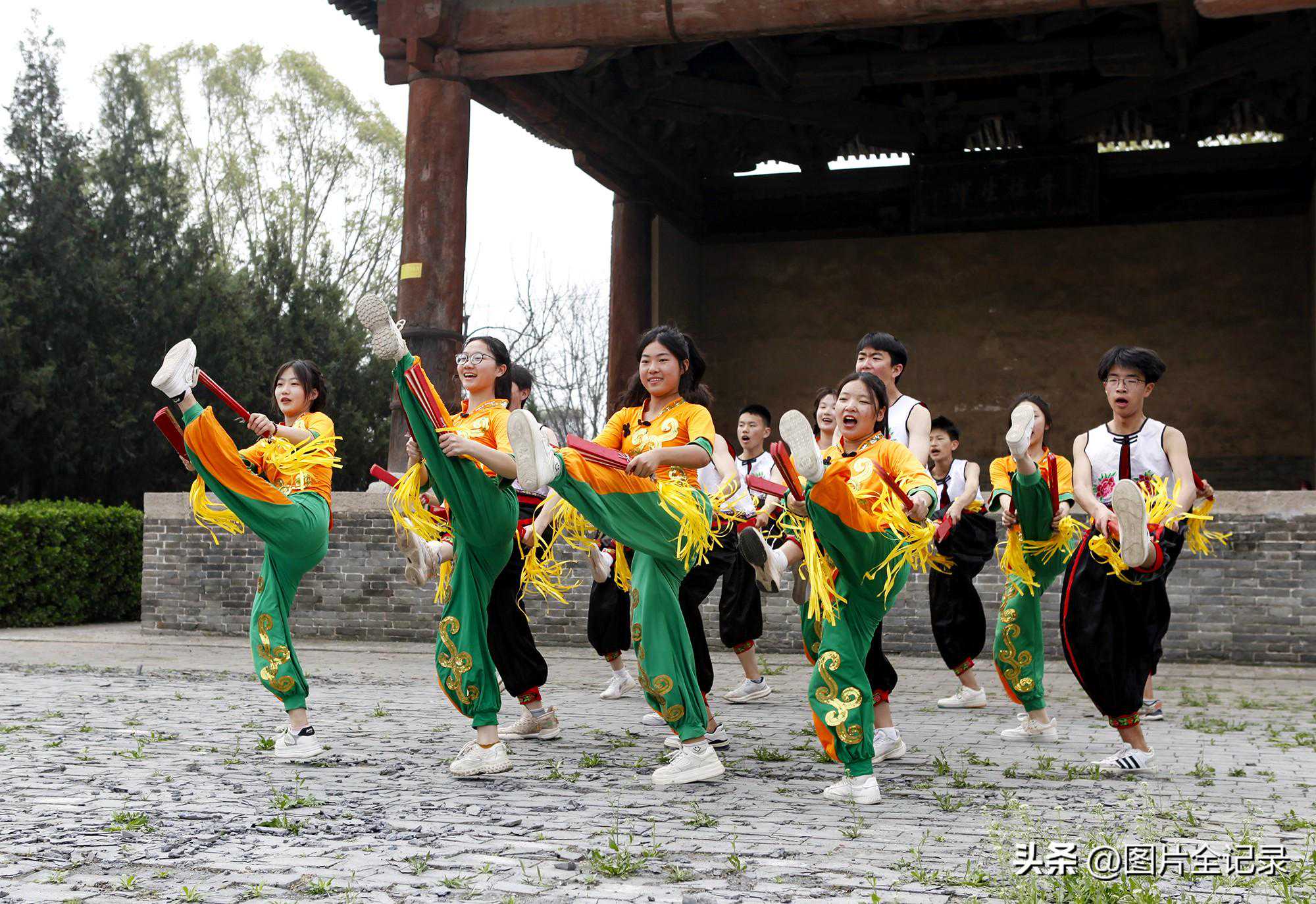 2024年4月2日,学生们在山西省临汾市翼城县南梁镇武池村乔泽庙元代古戏台前表演国家级非遗“浑身板”。