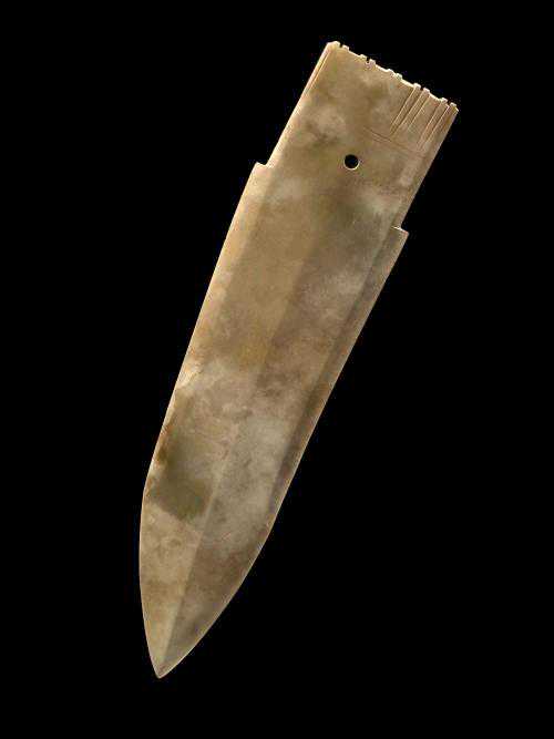 ▲现在我们看看那个时期,武士常用什么武器,准确说,黄帝时代尚处于"新石器晚期",青铜器刚刚萌芽,武器主要还是用石料制造,不过往往是精选的细腻、坚固、美观的石料,玉文化就是这样诞生的,所以,大量玉料制作的玉刀、玉矛出现