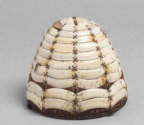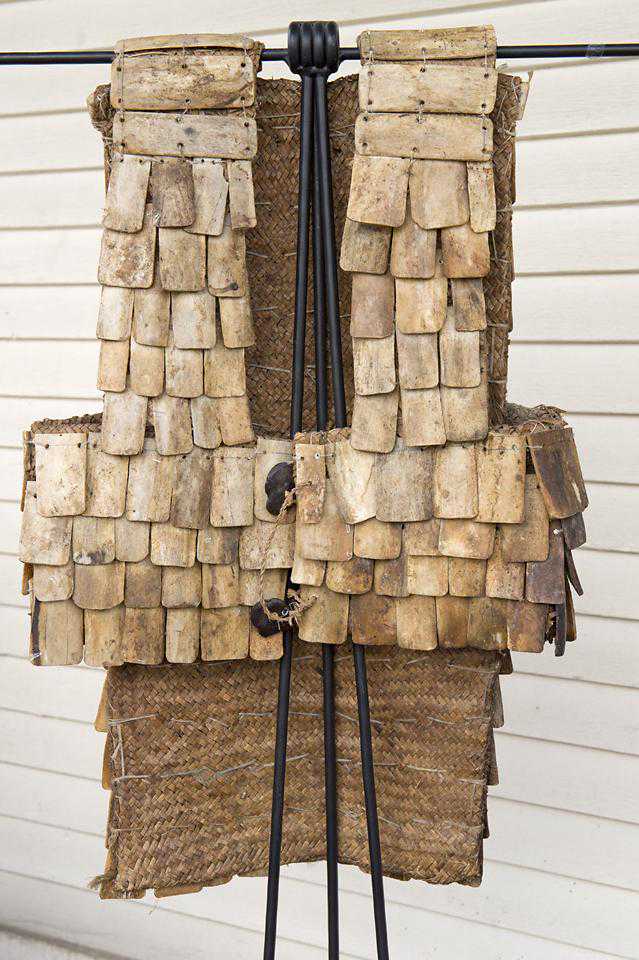 ▲当然,原始状态下的人们制造铠甲,最常见的还是用竹木、藤条类植物材料,这是印尼尼亚斯土著用藤条和鲨鱼皮制造的铠甲
