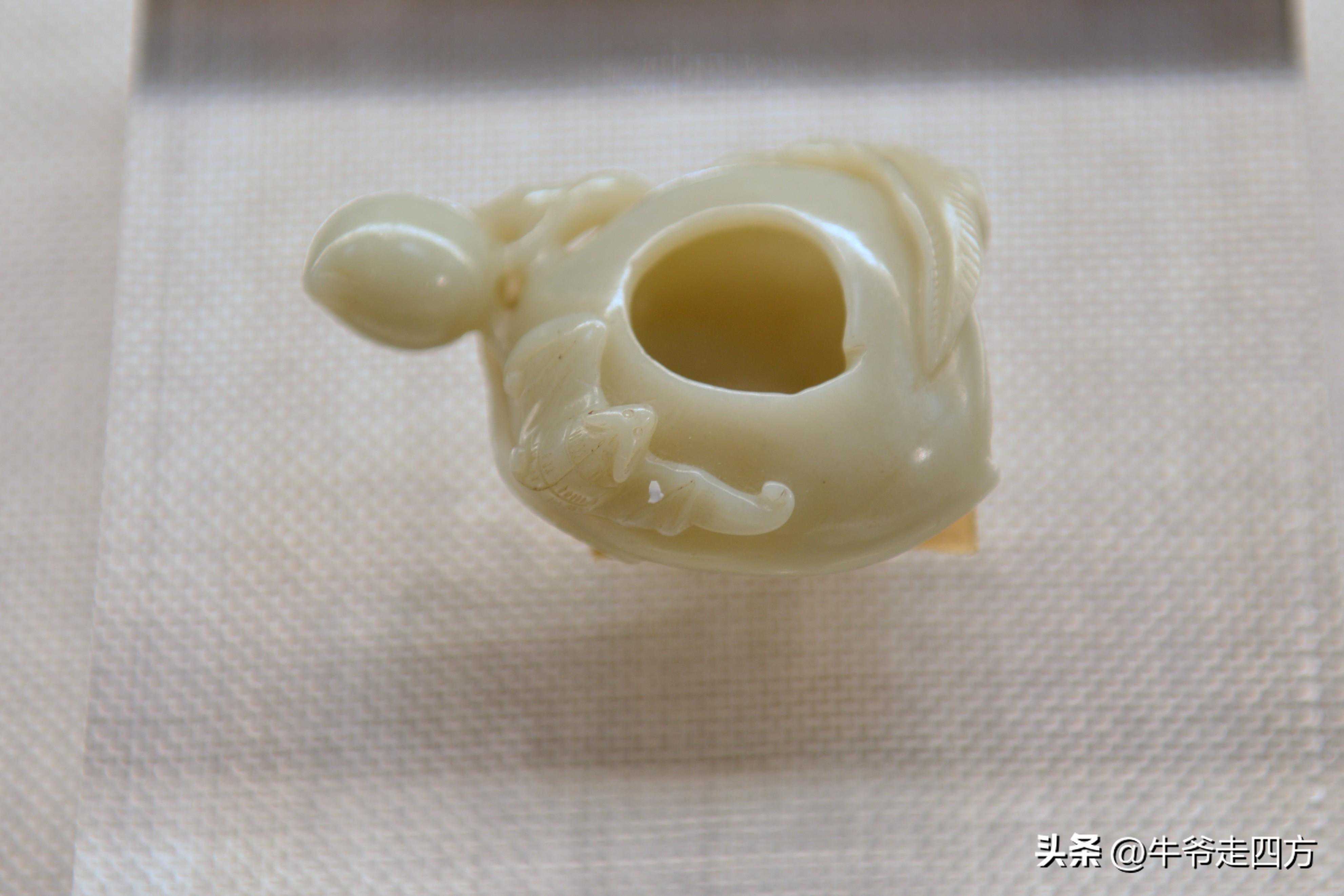 桃形水盂。通体以玉石琢成桃形,质地温润细腻,形态玲珑精巧,广口、弧底,侧壁浮雕以螭龙攀附其上,体态生动。
