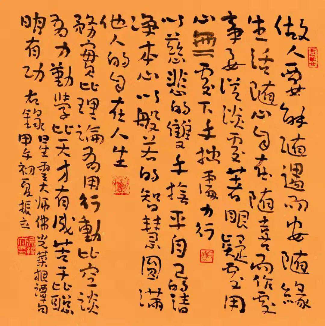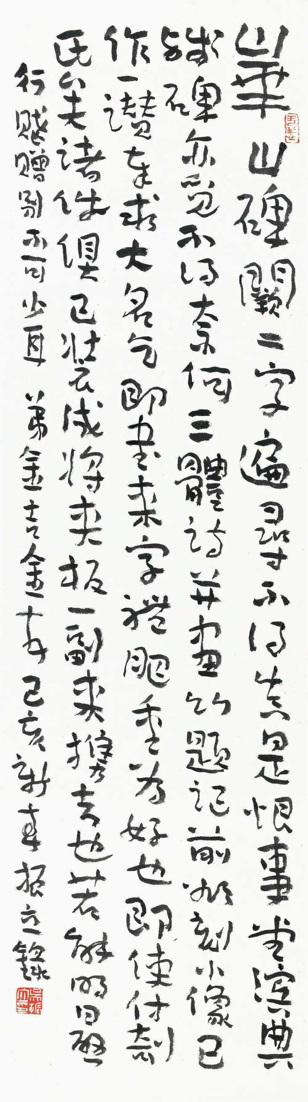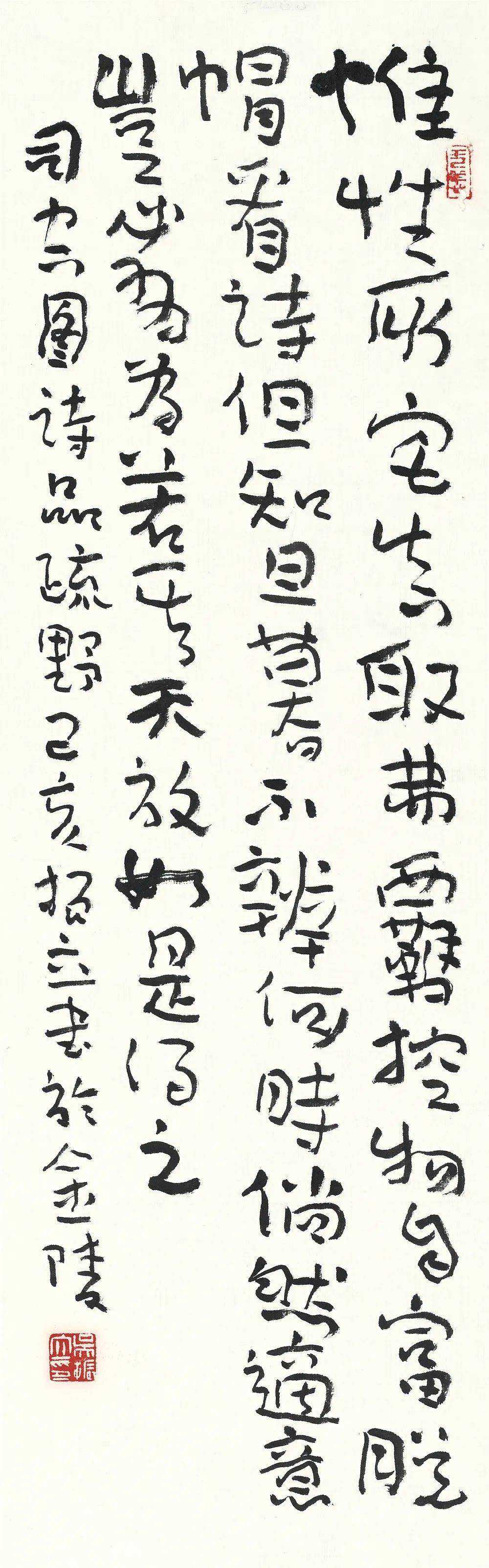 简言之,先生的字里,至少透露出这样几个方面的消息:其一,从容、淡定、自信、倔强,这是他的人生态度;其二,雍容、含蓄、高蹈、华贵,这是他的艺术信念;其三,自由、烂漫、宽厚、悠然,同时也有意无意地躲避着时髦和所谓主流,这是他当下的生命状态和属于自己的艺术观、价值观。先生自谓其书法受颜真卿、八大、金农和林散之影响最大,细细比较,不难看出先生于经典大师的取向是十分鲜明的。颜真卿倔强激烈于表而烂漫宽厚于里,八大笔墨冷寂落寞而心性华贵高蹈,金农行状看似自由不羁实则冷眼深情,而林散之以曼妙灵动的点画线条参悟佛事抟虚真境。他们的艺术就是他们的人生,他们是踏踏实实行走在大地上的。颜真卿不是床明净几、笔墨精良而是歌哭劳顿、出生入死,八大不是肥马轻裘、觥筹交错而是隐姓埋名、吟啸孤寂,金农不是以尺论价、日进斗金而是“和葱和蒜卖街头”,林散之不是前呼后拥、大师泰斗而是默默念佛年近八旬始为人知。他们没有别的选择,所以只能义无反顾。