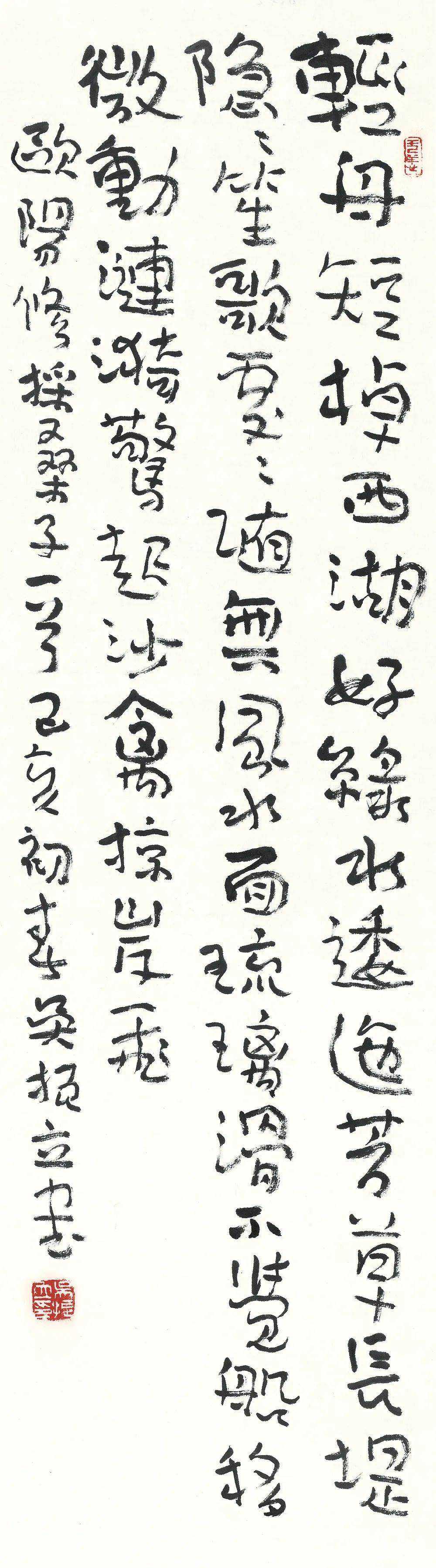 先生在他们那里汲取的不仅仅是笔法章法,而更是一种生活的信念和笔墨的态度。这些,构成了他精神和灵魂的家园。先生常常慨叹,你看他们总是忙得像真事似的。是的,书坛哓哓诸公衮衮,他们的选择太多是因为自作多情的使命和责任太多,所以必须讲经布道、必须讲话剪彩、必须应酬交接、必须干着那些必须。而先生年届七旬偏居繁华都市之一隅,每日里或骑了单车接送小外孙上学下学,或挎了菜篮买菜做饭,忙里偷闲抻纸濡墨,一笔一画都落在生命的实处。大约十年前,我到南京看望先生,次日中午南京书界几位朋友在南大招待所聚会,先生就是骑着一辆单车来的。饭后,外面飘起小雨,朋友们或自驾或打车四散而去,这时先生从兜里掏出一件雨衣披上,跨上单车,慢慢地消失在细雨中。那种自然、淡定,仿佛他的点画线条,一笔一笔写来,是那么质朴从容、平静悠然。许多年过去了,当年的场景像一幅画一样深深嵌进了我的脑海里,且时时浮现出来。