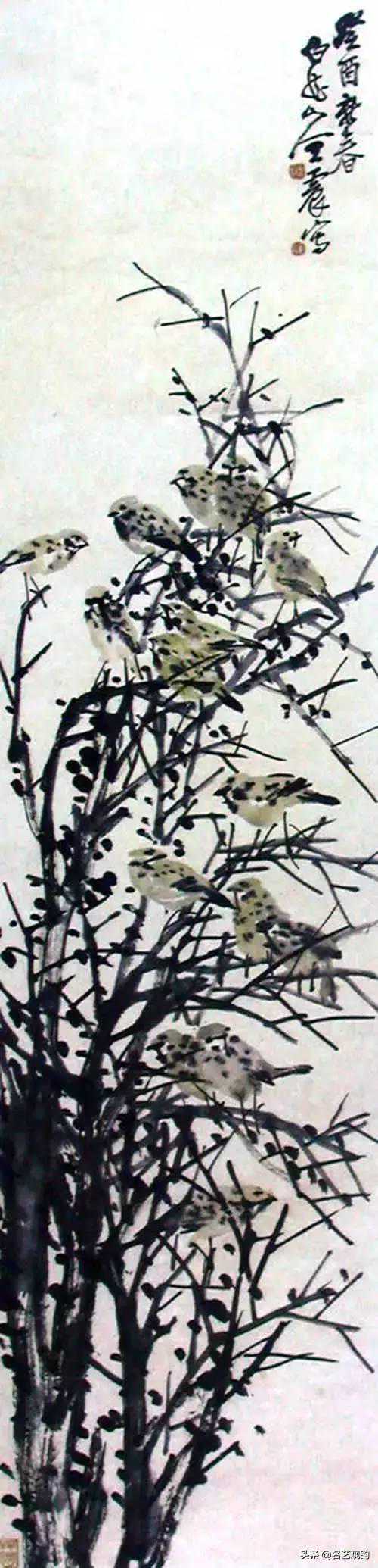 ▲瓦雀图,王震,1933,纸本设色,136.5×33.5cm,中国美术学院藏