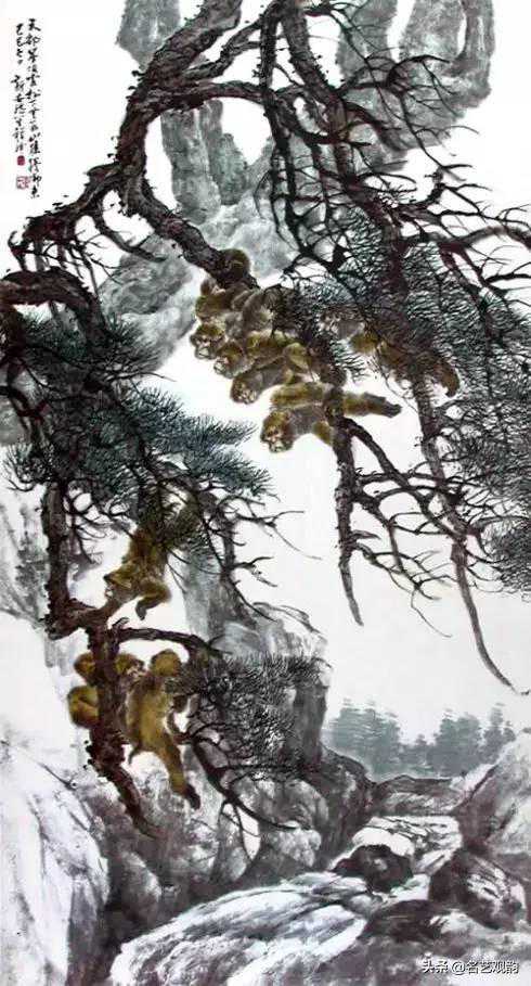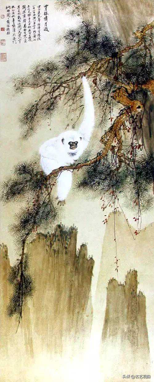 ▲天都山猿,程璋,1933,纸本设色,149×80.7cm,朵云轩藏。