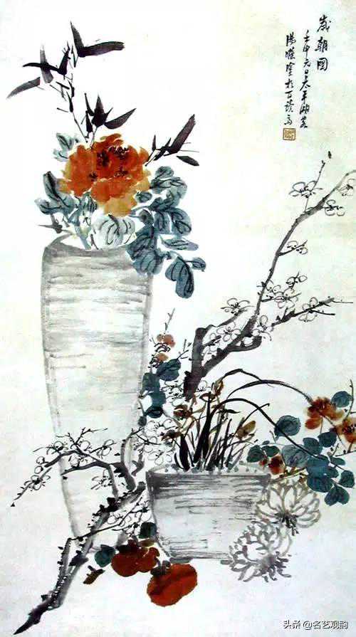 ▲岁朝图,汤涤,1932,纸本设色,98.5×55cm,中国美术馆藏。