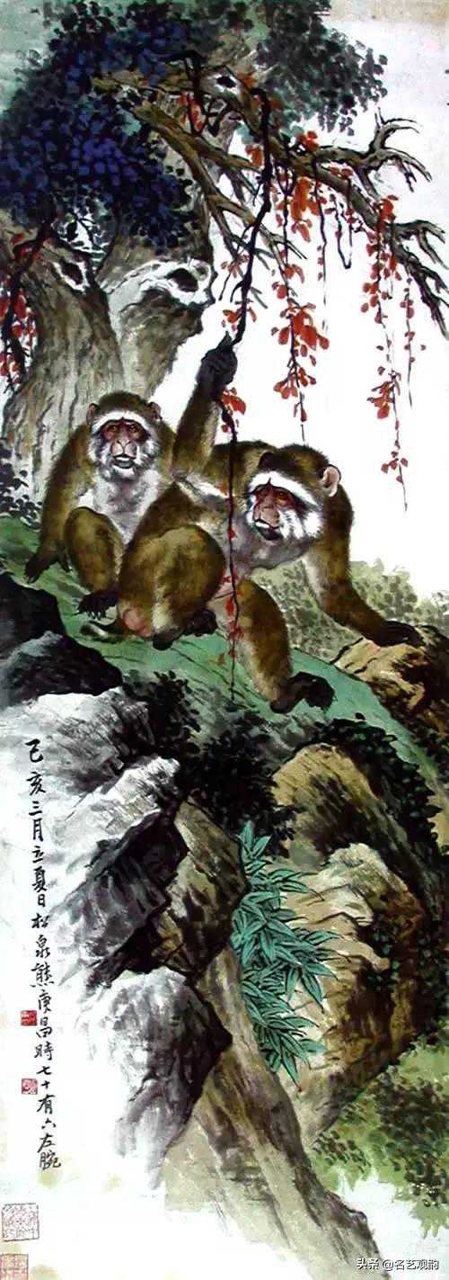 ▲双猴,熊松泉,1959,纸本设色,116×41cm,上海中国画院藏。