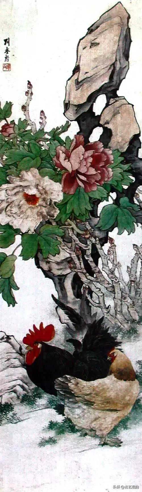 ▲双鸡牡丹,刘奎龄,1959,绢本设色,103×35cm,天津人民美术出版社藏。