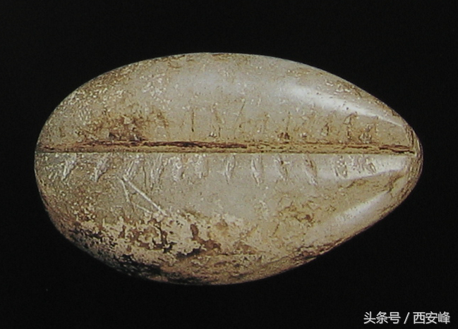 安徽省巢湖市北山头西汉墓出土,现藏巢湖市博物馆。白色一对,局部有淡褐色丝斑和深褐色沁。海贝形,体呈不规则椭圆形,正面微凸,背部偏侧切磨直凹槽,上阴刻多道平行短线表示贝纹,一侧刻有细三角纹,表面抛光,侧面磨平。
