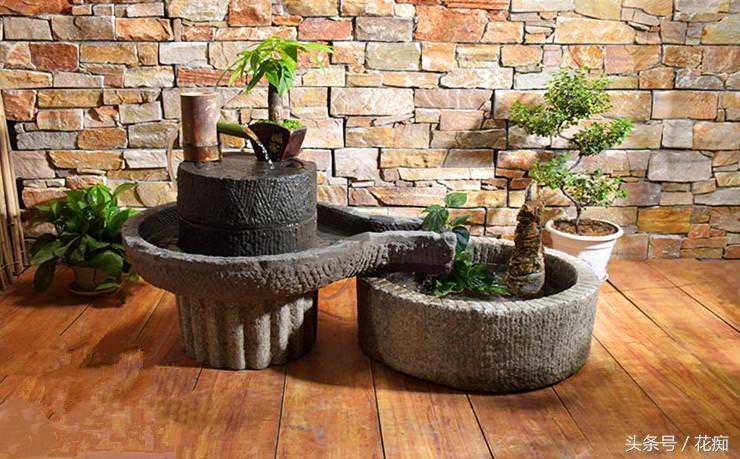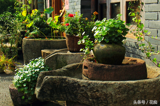 石磨做花架,这个比较简单,将石磨摆放在显眼而又不碍事的地方,将所种花卉摆放到上面,这样一个简单而又具有时代感的花架就形成了,估计很多人看到后都会喜欢的不得了,平时可保持石磨湿润,然后就会在上面长出青苔,这样就更有复古感了。