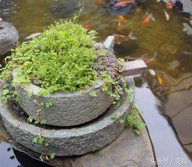 石磨养花,虽然少见,但是养出来却是美美的,石磨本来就有一定的高度,然后在上面种上一些具有垂吊效果的花卉,垂吊在半空中,将石磨似掩非掩,如果将其放置在水池中,在养上几条锦鲤,那就更有一番美意了!