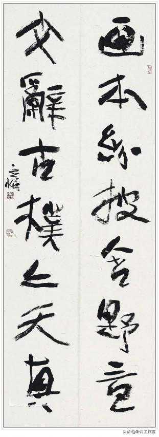何应辉《隶书画本文辞七言联》2019年作。何应辉的书法艺术在业内还是颇受好评的。业内人士认为,何应辉的书法思想概括起来只有四个字:高大深新。