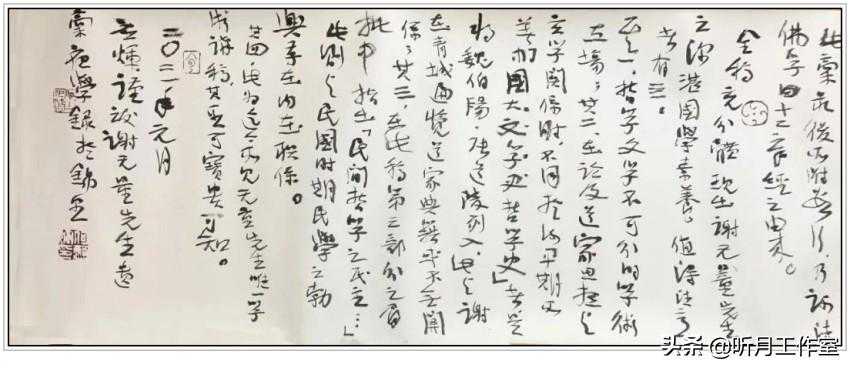 何应辉《草书录马一浮论书语》2020年作。何应辉在创作和欣赏中推崇四项审美标准:高、大、深、新。高,指格调、境界、品位高,相对于低俗、平庸而言;“大”,指气象雄浑,宏大和艺术含量丰富,相对于猥琐、怯弱、雕琢、偏狭、小器而言;“深”,指意韵深厚,相对于贫乏、简单、浅露而言;“新”,指风格、技法的独创性、开拓性,是指鲜明而成功的个性,是在前人基础上的发展超越。