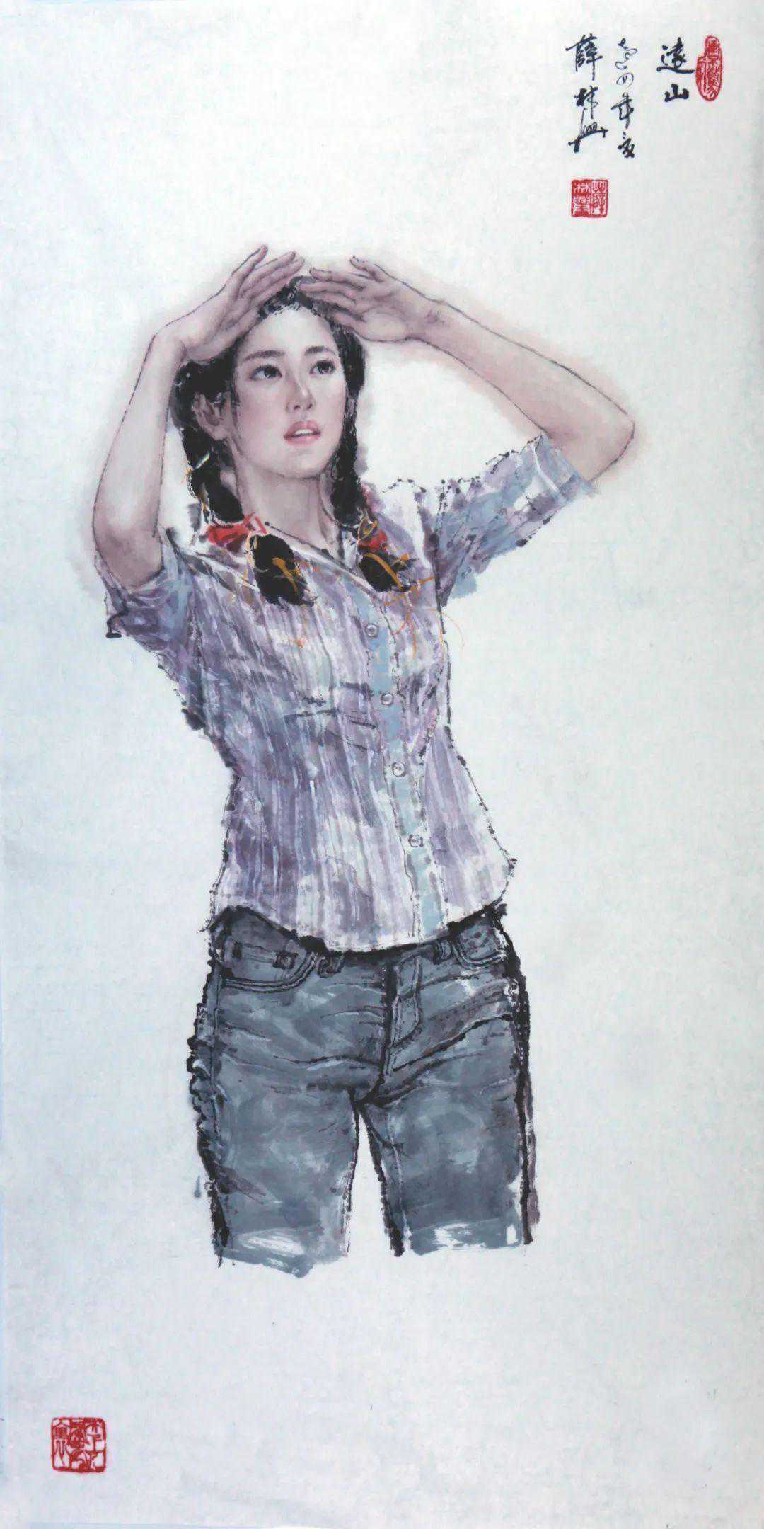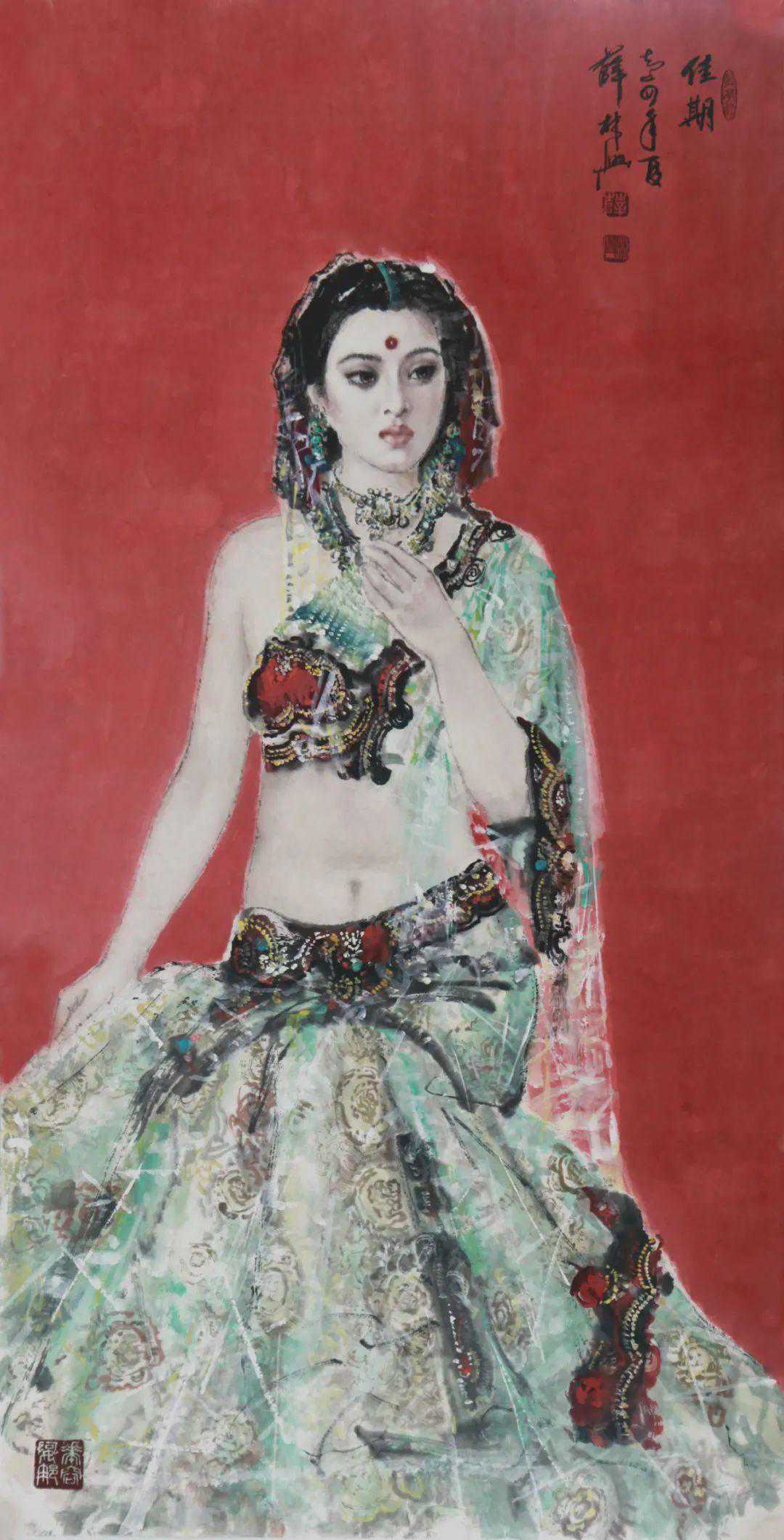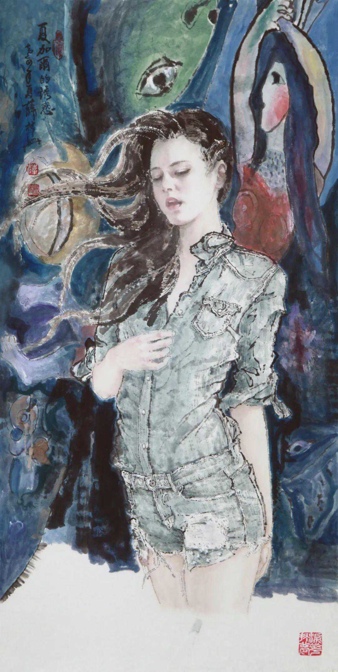上实下虚的对比手法,使美女更加迷离,使观者进入了一个虚幻世界,薜先生在美女表现手法上,借鉴了西画的表现形式,具有鲜明的特点,强烈的个性,可喜可贺。