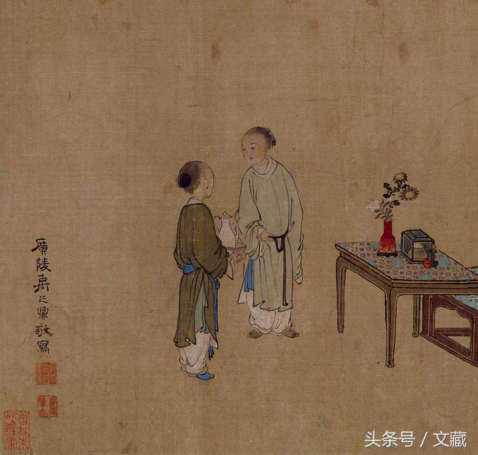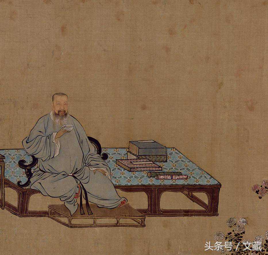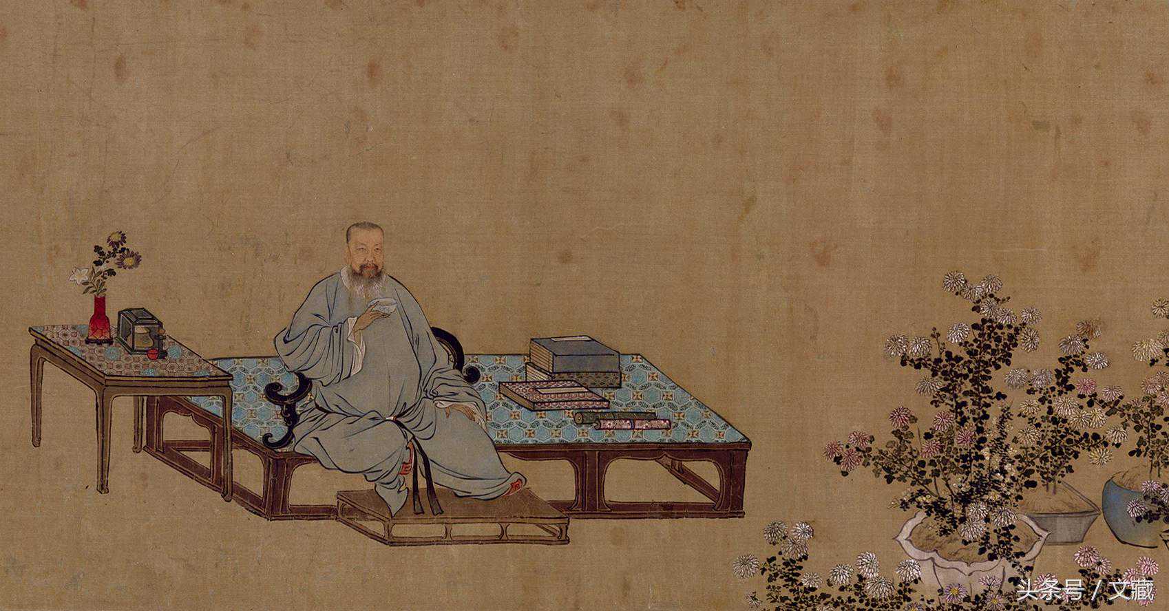 《王原祁艺菊图》一向被认为是禹之鼎晚年佳作之一,该图绘王原祁在庭院中赏菊的情景。画中的王原祁方脸长髯,身着长袍,持杯端坐,神态悠然,气度雍容;榻前放置精心栽培的盆菊、蒲草,几上放置内插瑞菊的红釉双陆式花瓶一个和盛有香炉的套盒一只,榻上置书函、画卷之属,布置井然有序;身后两仆侍立,画面右侧一仆抱瓮而来。这些衬景的设置无不衬托出王原祁的高雅性情,并含蓄地点明其身份与地位。