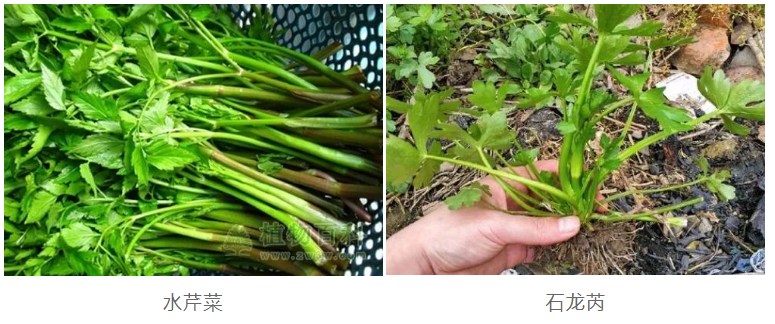 有毒的石龙芮叶片为掌状分裂,水芹菜叶片呈羽状分裂、枝茎更长;石龙芮开黄花,水芹菜则开白花。