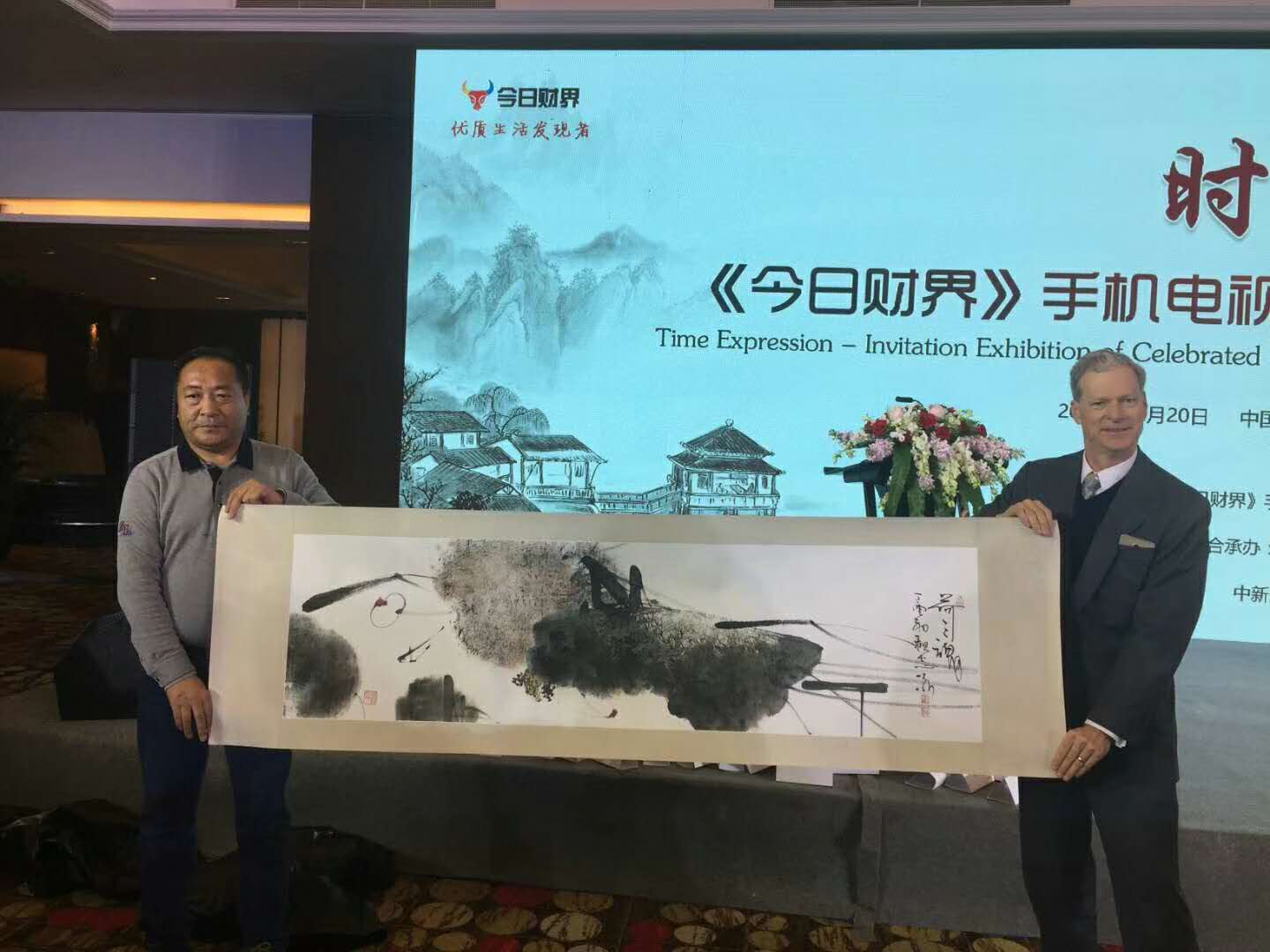 韩志冰先生作品《荷之魂》被美国洛克菲勒家族收藏,照片中是韩志冰先生与洛克菲勒家族第五代掌门人,史蒂文·C·洛克菲勒二世!