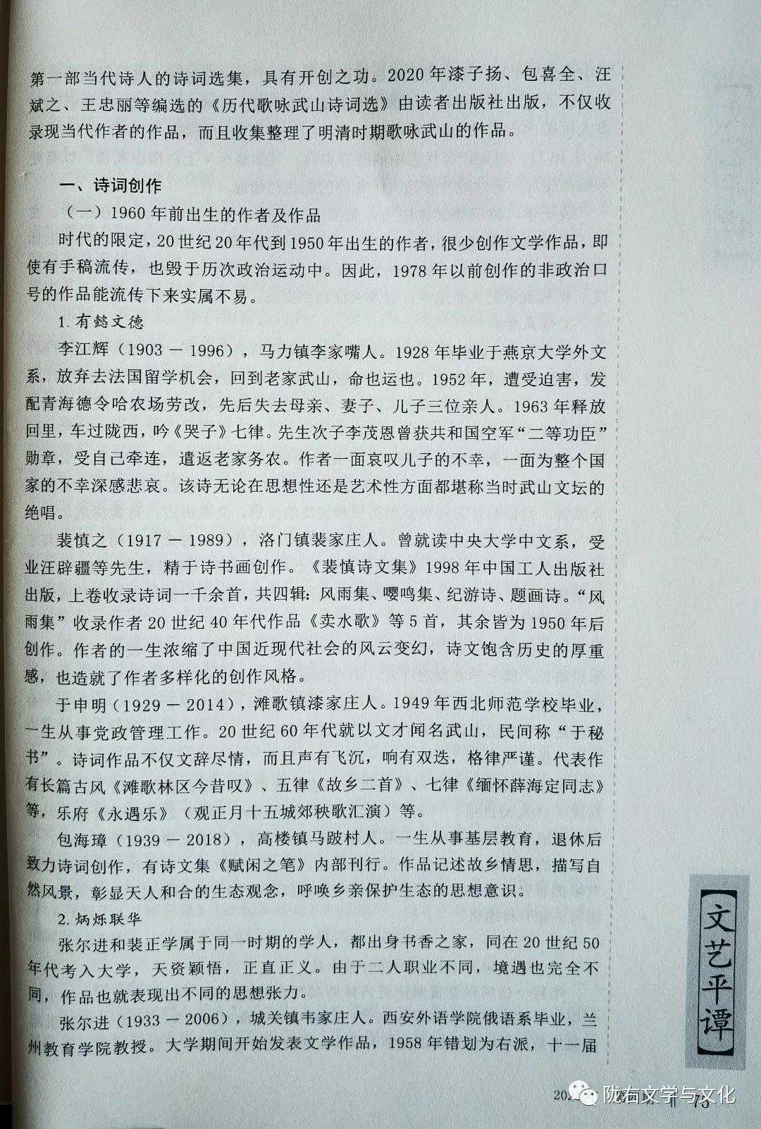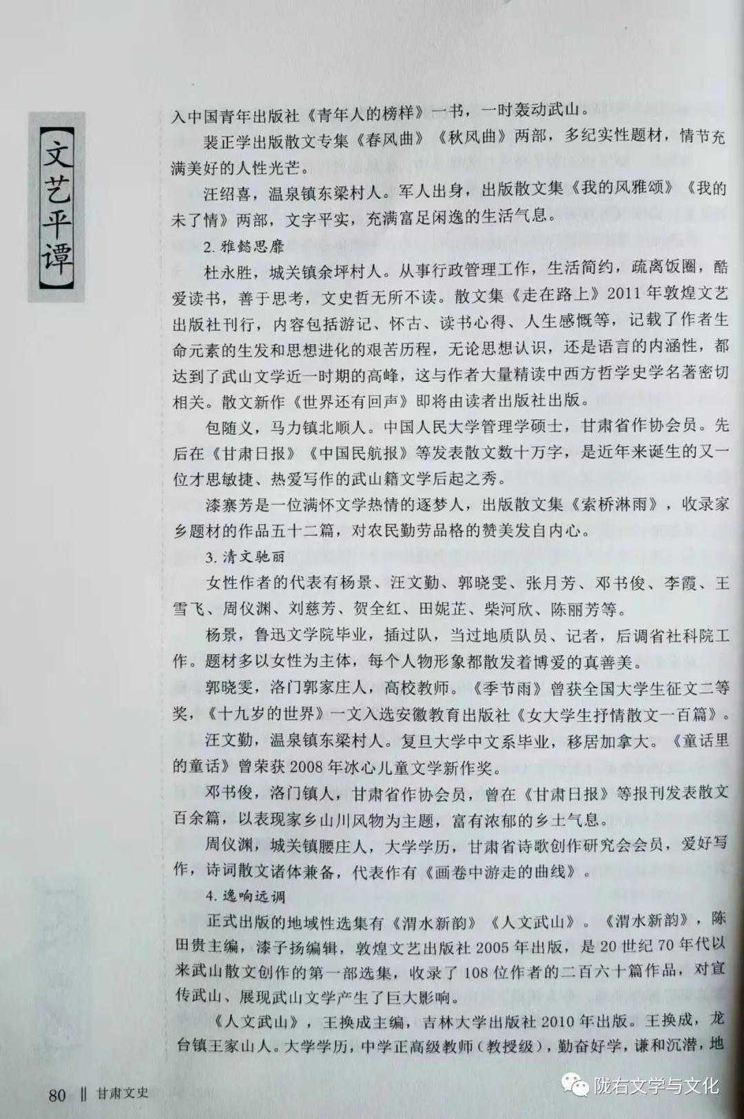 1.沉吟铺辞李江辉于1945年秋,创作《还乡断简》系列游记,其中《神秘的岷州》《拉卜楞之行》等发表于兰州《》。韩廷秀,城关镇韩川人,青海师专毕业,武山一中教师,创办武山文学社团及校刊,2004年散文结集出版之际,溘然长逝,令人惋惜。兰文蔚是五十年代到八十年代一直保持旺盛创作力的一位作者,纪实性散文《农业社的会计》在五十年代《》发表后,收入中国青年出版社《青年人的榜样》一书,一时轰动武山。裴正学出版散文专集《春风曲》《秋风曲》两部,多纪实性题材,情节充满美好的人性光芒。汪绍喜,温泉镇东梁村人。军人出身,出版散文集《我的风雅颂》《我的未了情》两部,文字平实,充满富足闲逸的生活气息。